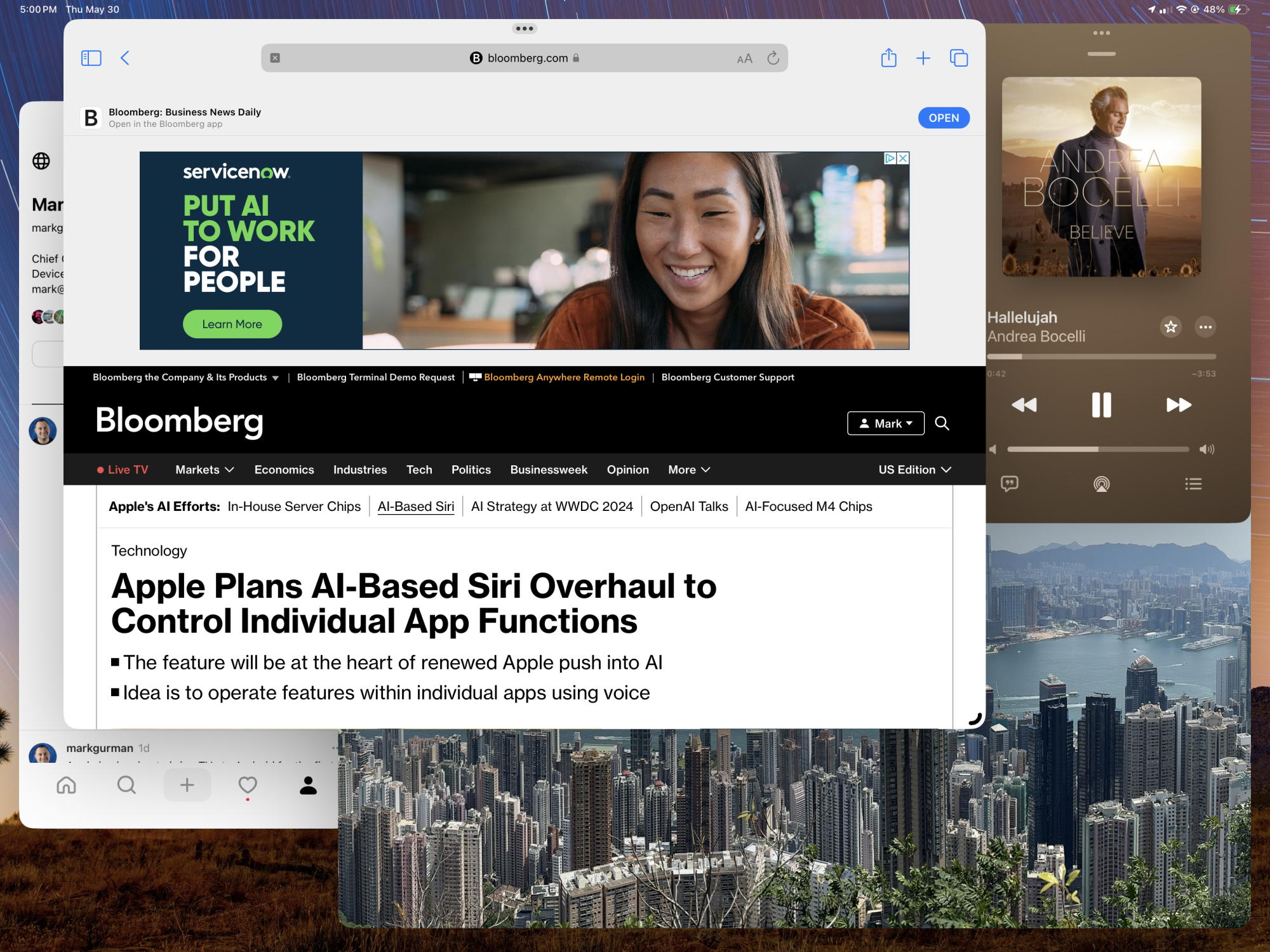 旧Magic Keyboard(左)与新型号相比。来源:Mark Gurman然后是多任务处理能力。现在,这对我来说多年来一直是一个大问题。我一直觉得苹果可以通过使iPad更像Mac来改进多任务处理。公司仍然没有完全解决这些问题,但新的iPad确实朝着正确的方向迈出了步伐。
