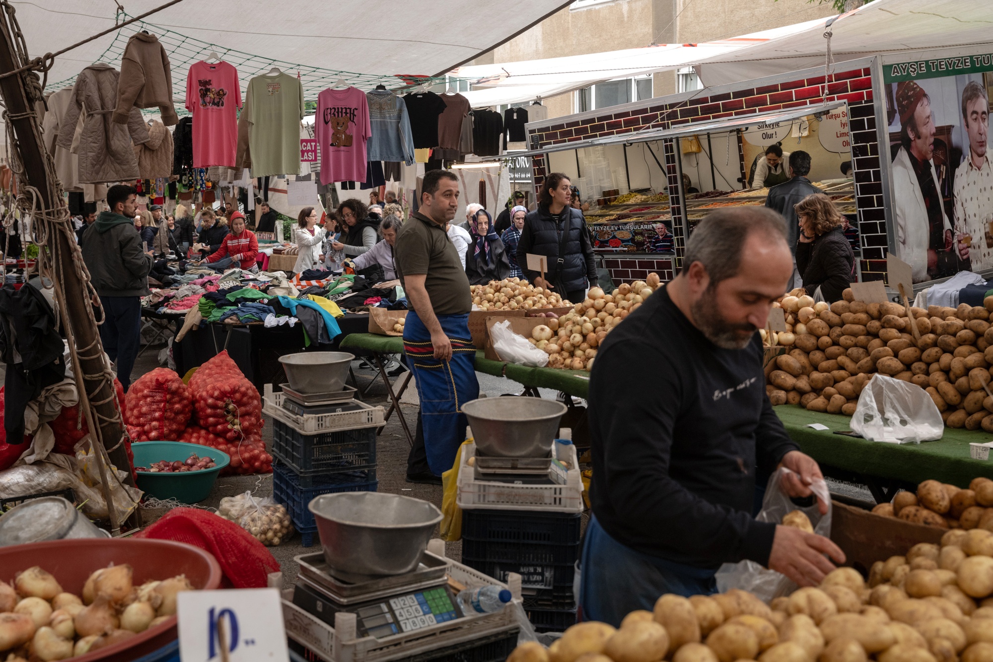 在土耳其伊斯坦布尔的星期五巴扎市场上的蔬菜摊贩。