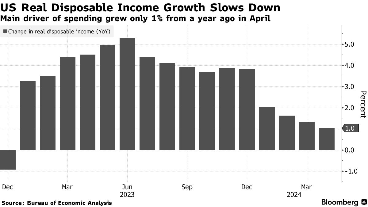 但随着通货膨胀持续,迫使美联储保持较高的借贷成本,美国经济终于开始放缓。对工人的需求已从疫情高峰下降,这意味着雇主不再迅速提高工资。个人消费支出报告显示,4月份工资和薪金增长了0.2%,为五个月来最小的增幅。
