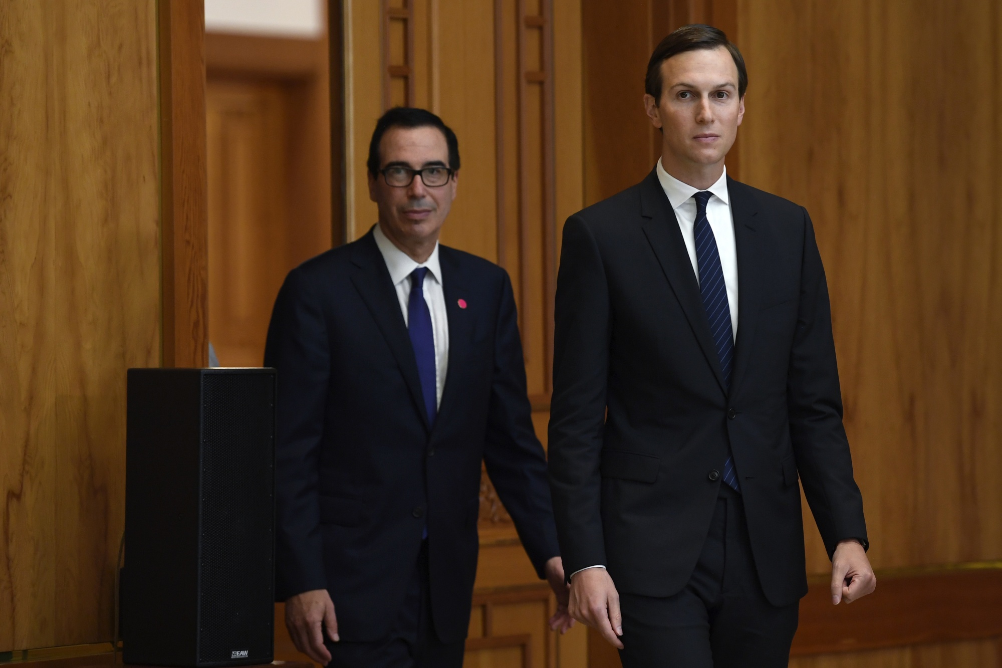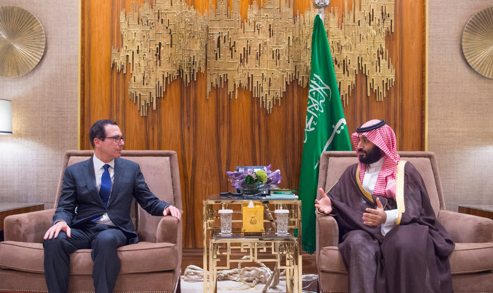 在利雅得举办的被称为“沙漠中的达沃斯”的会议上,姆努钦在沙特阿拉伯最高央行行长和软银集团公司负责人之间穿梭,每次会议都以侍者端上带豆蔻和藏红花的阿拉伯咖啡开场。他们不停地给姆努钦添满杯子,直到一名助手解释说他必须用手盖住杯子才能让他们停止。