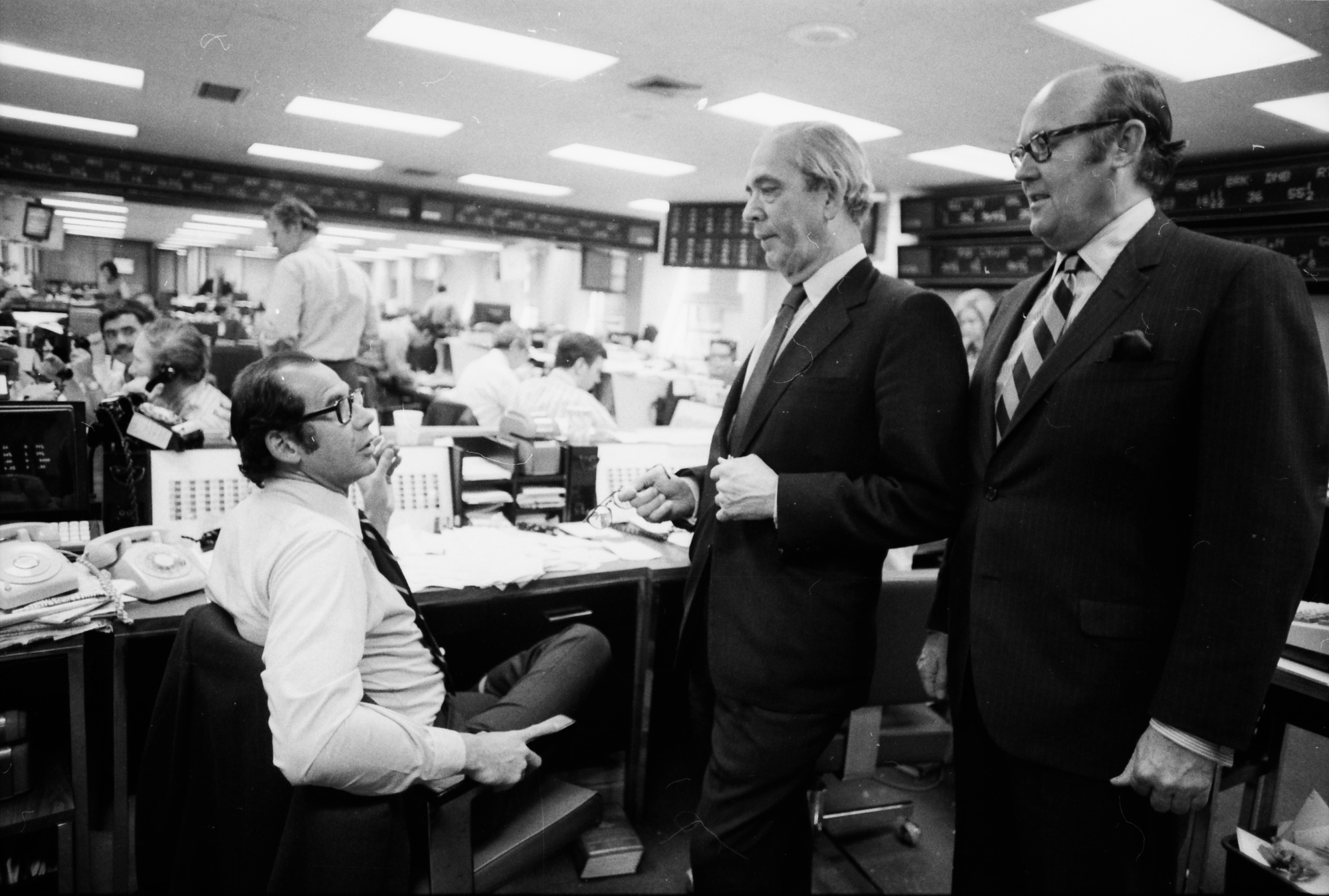投资者的父亲罗伯特·姆努钦,与高盛交易大厅的古斯·莱维和霍华德·杨在1971年。摄影师:厄尼·西斯托/纽约时报/Redux在他担任财政部长的第一年访问世界不同地区,预示着即将发生的事情。