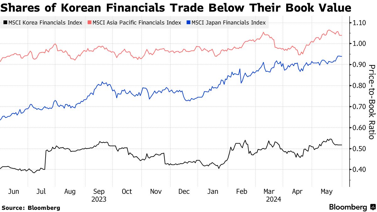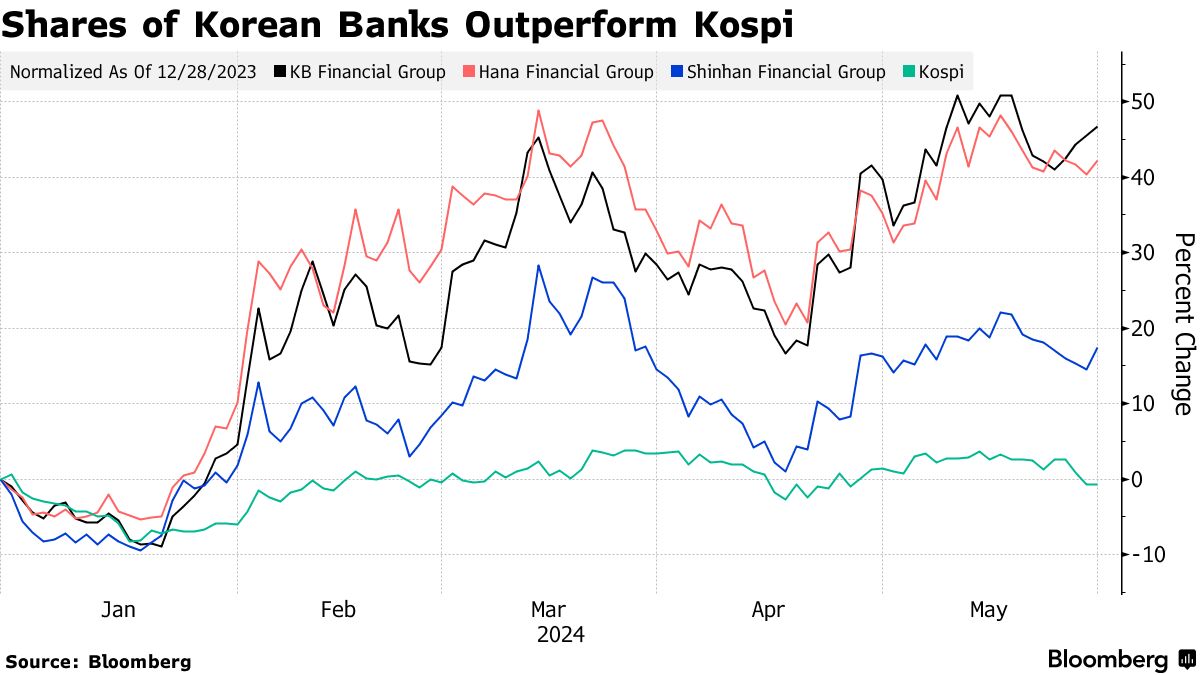 它们的低估值以及银行对企业价值提升计划的回应迹象,使它们的股价今年上涨了多达47%。KB金融集团和新韩金融集团最近告诉投资者,它们的目标是实现10%的股本回报率,打破了规范以避免设定基准。