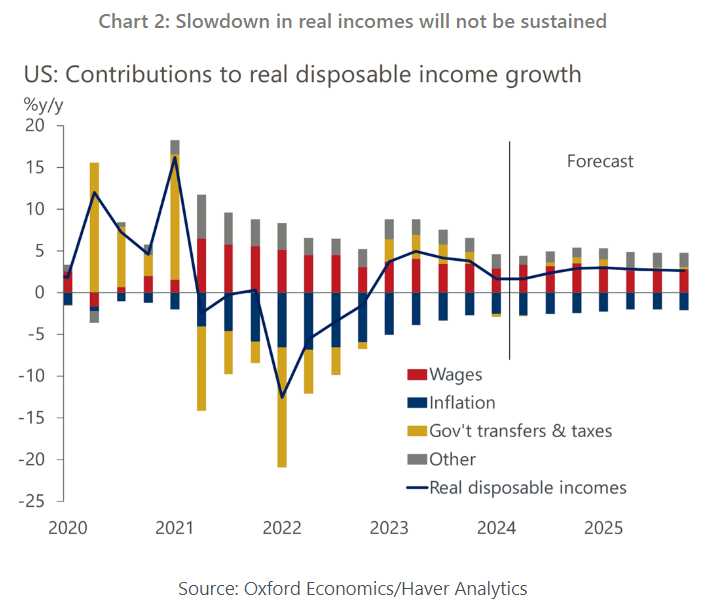 牛津经济学为通货膨胀和收入对可支配收入的影响提供了一个方便的指南。在几个季度里,通货膨胀吞噬了所有收入的增长,但现在已经结束: