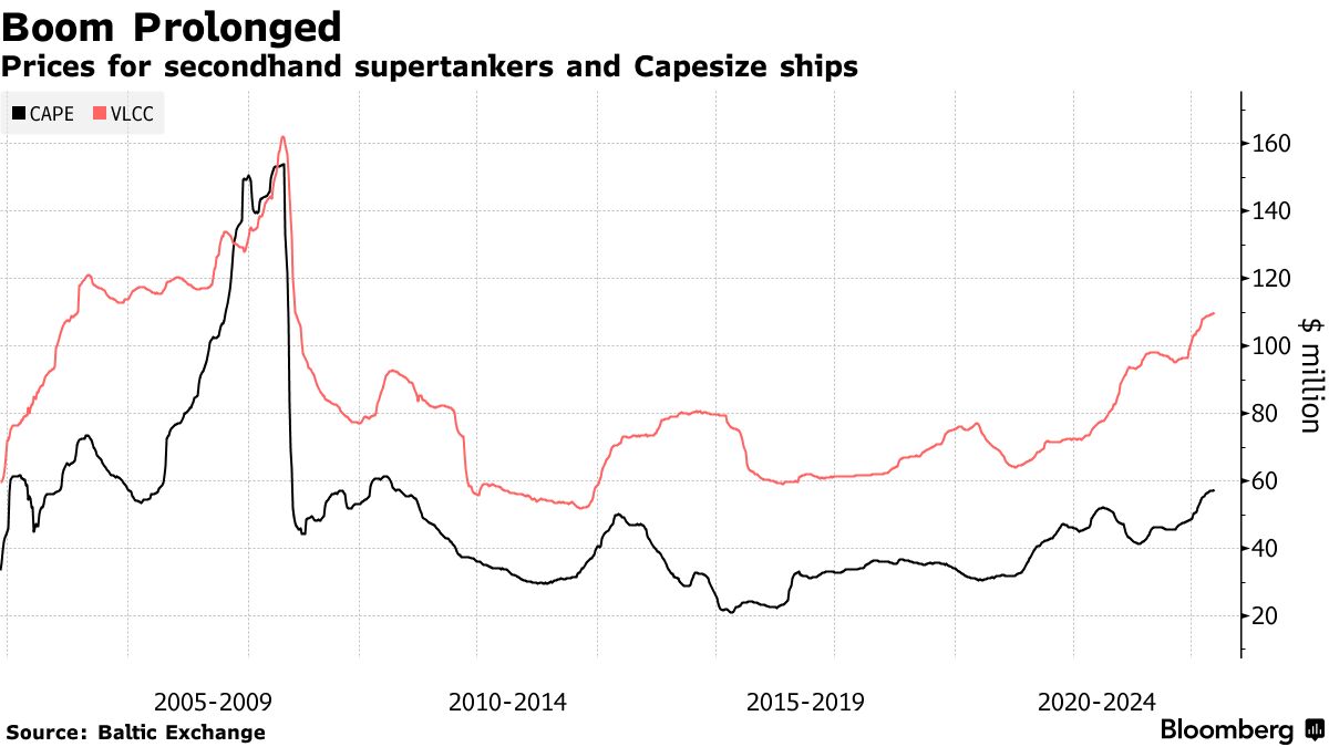 相反,一些船东正在抢购二手船只,以便能够从当前市场中获利。杜兰说,这意味着他们不必担心他们的船只在未来几年变得过时。波罗的海交易所的数据显示,五年龄的巨型散货船和超级油轮的价格是十多年来最高的。