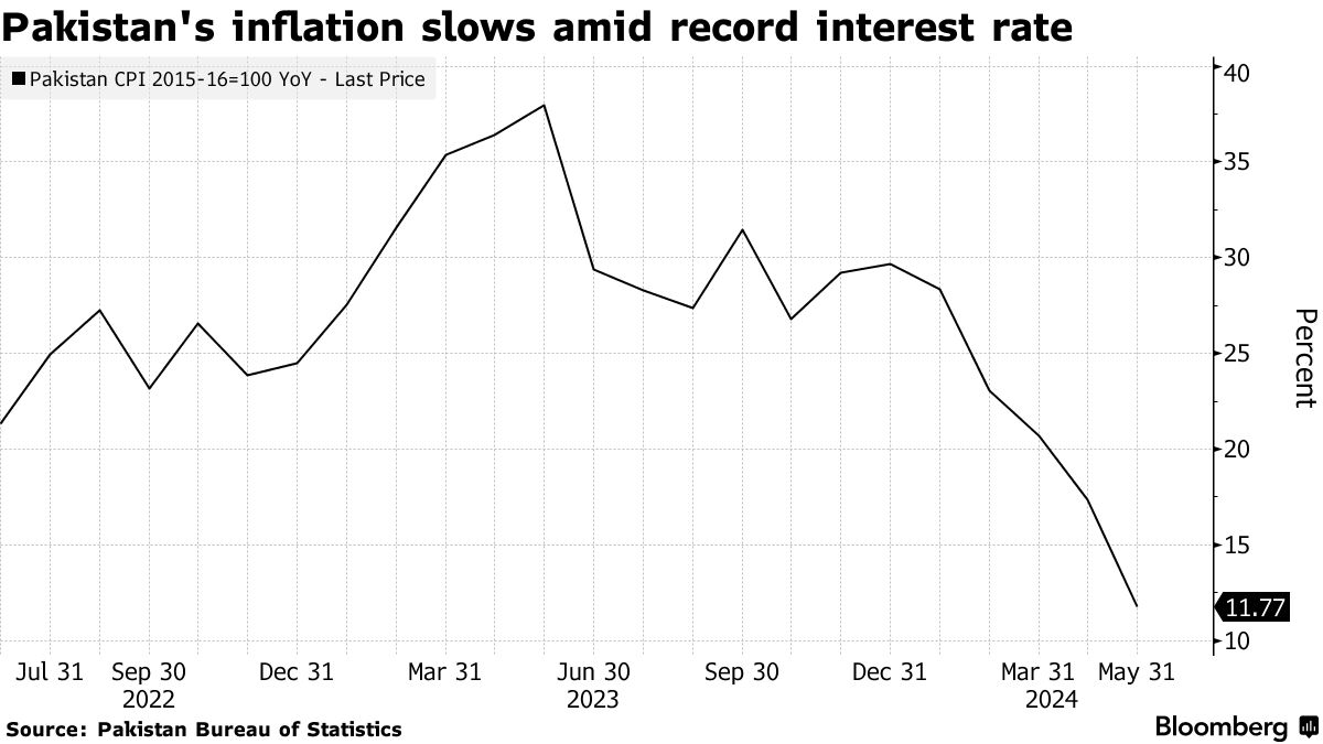 根据巴基斯坦统计局周一发布的数据,5月份消费者价格同比上涨11.76%,为近两年半来的最低水平。这超过了彭博调查中预计的13.7%增幅,与4月份的17.34%增幅相比有所下降。