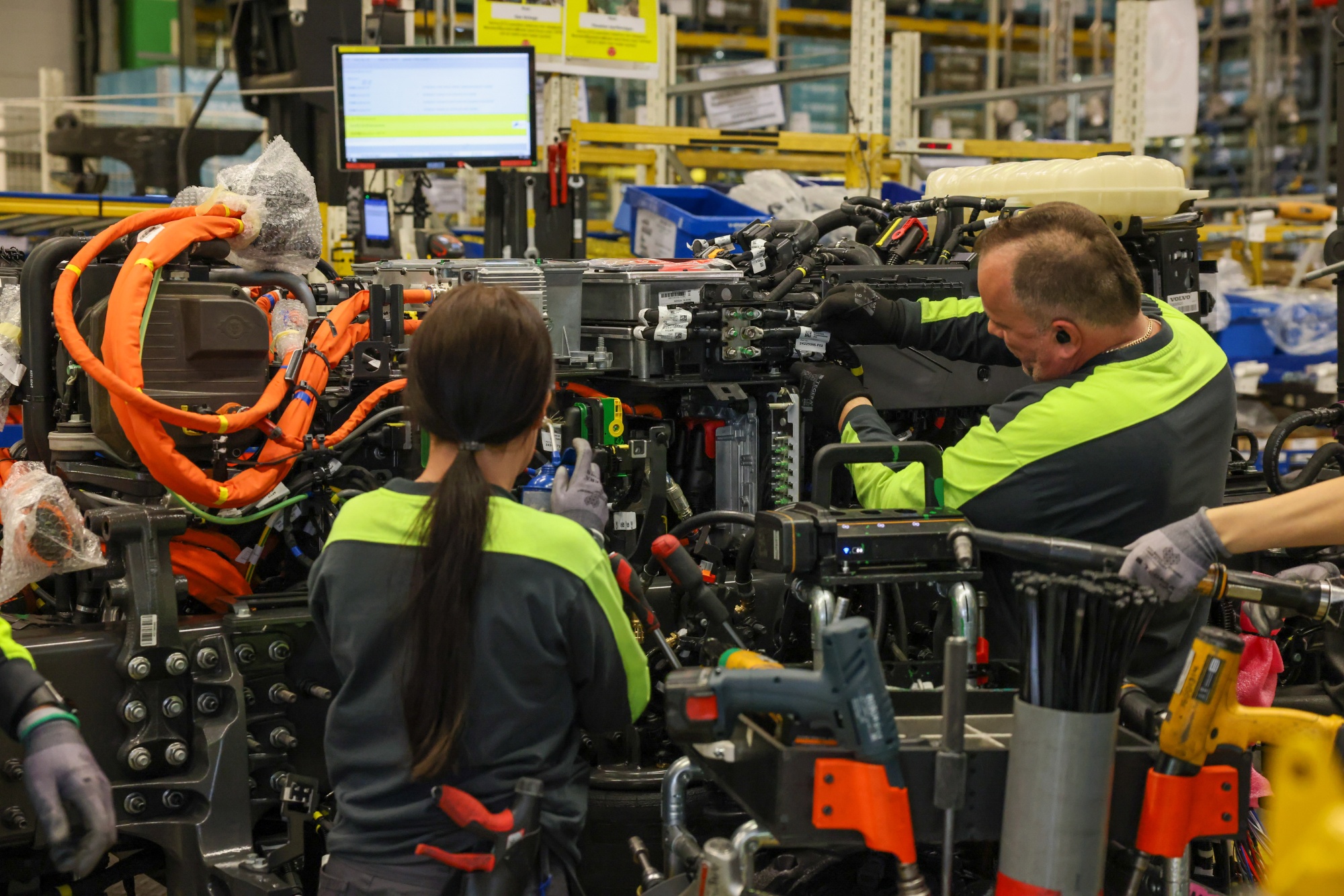 哥德堡的卡车装配线。摄影师:Hollie Adams/Bloomberg