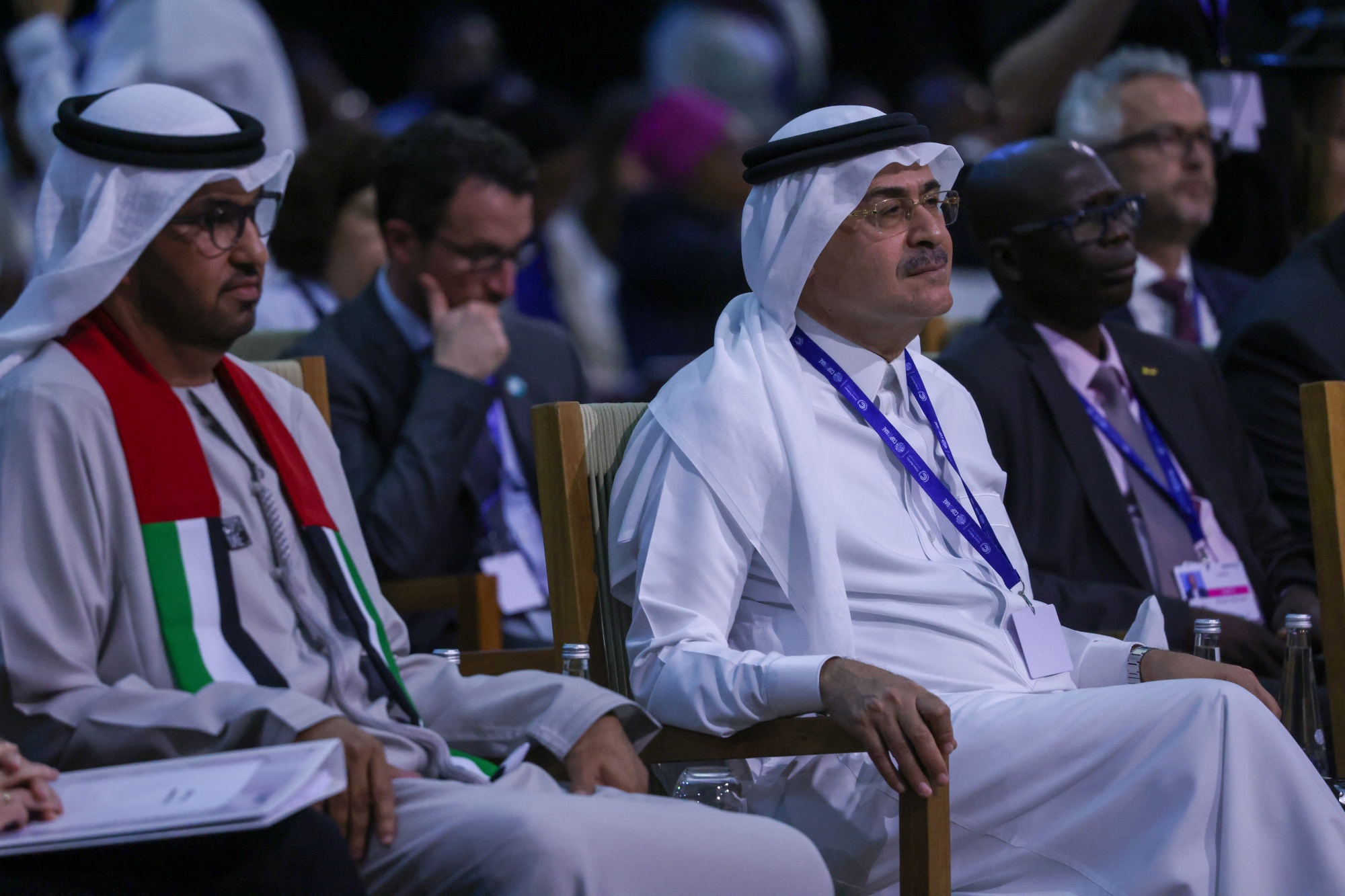 苏丹·艾哈迈德·阿勒贾贝尔,阿布扎比国家石油公司首席执行官,左,和沙特阿美公司首席执行官阿明·纳瑟尔。OPEC+同意允许阿联酋明年额外增加30万桶/日的供应。
