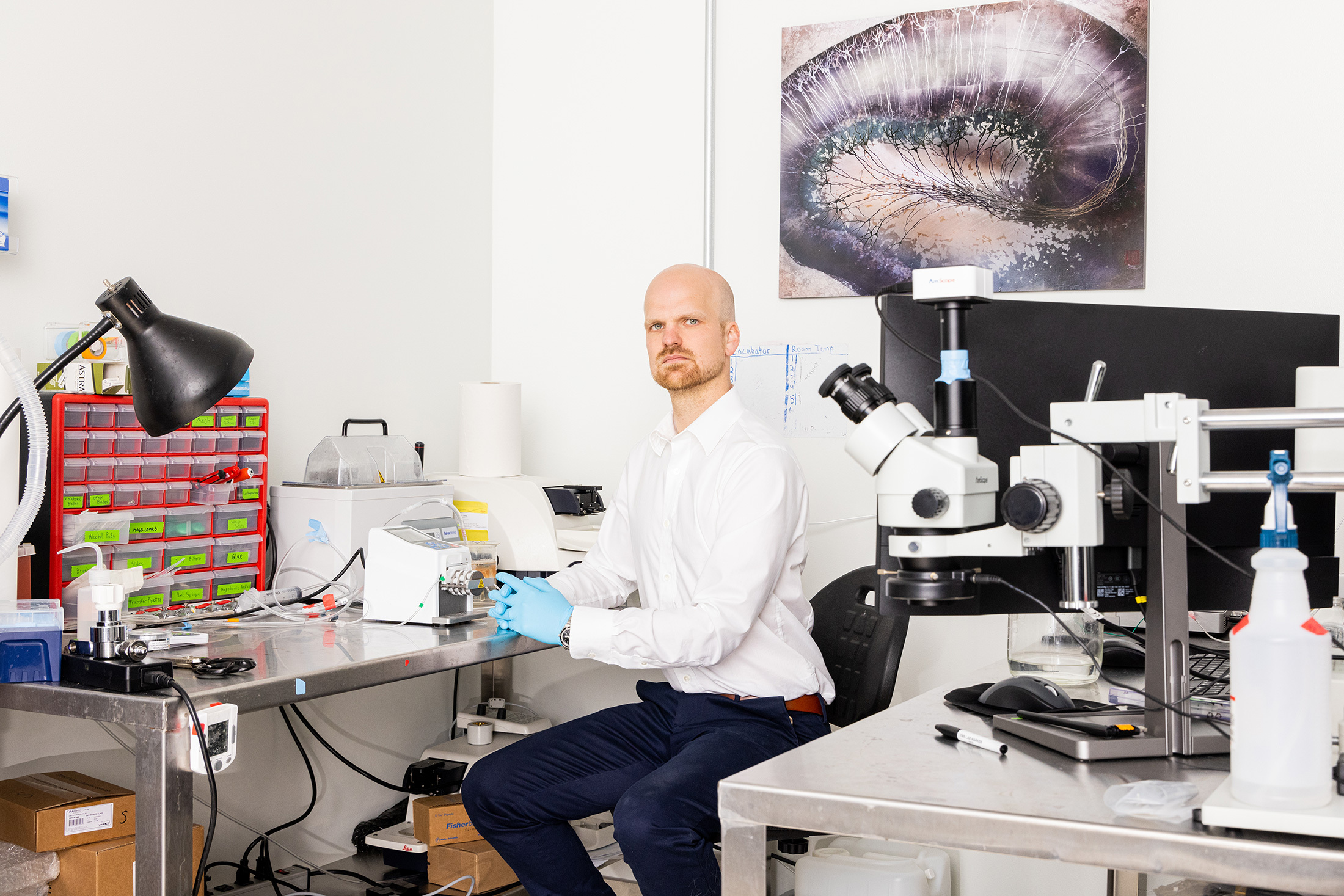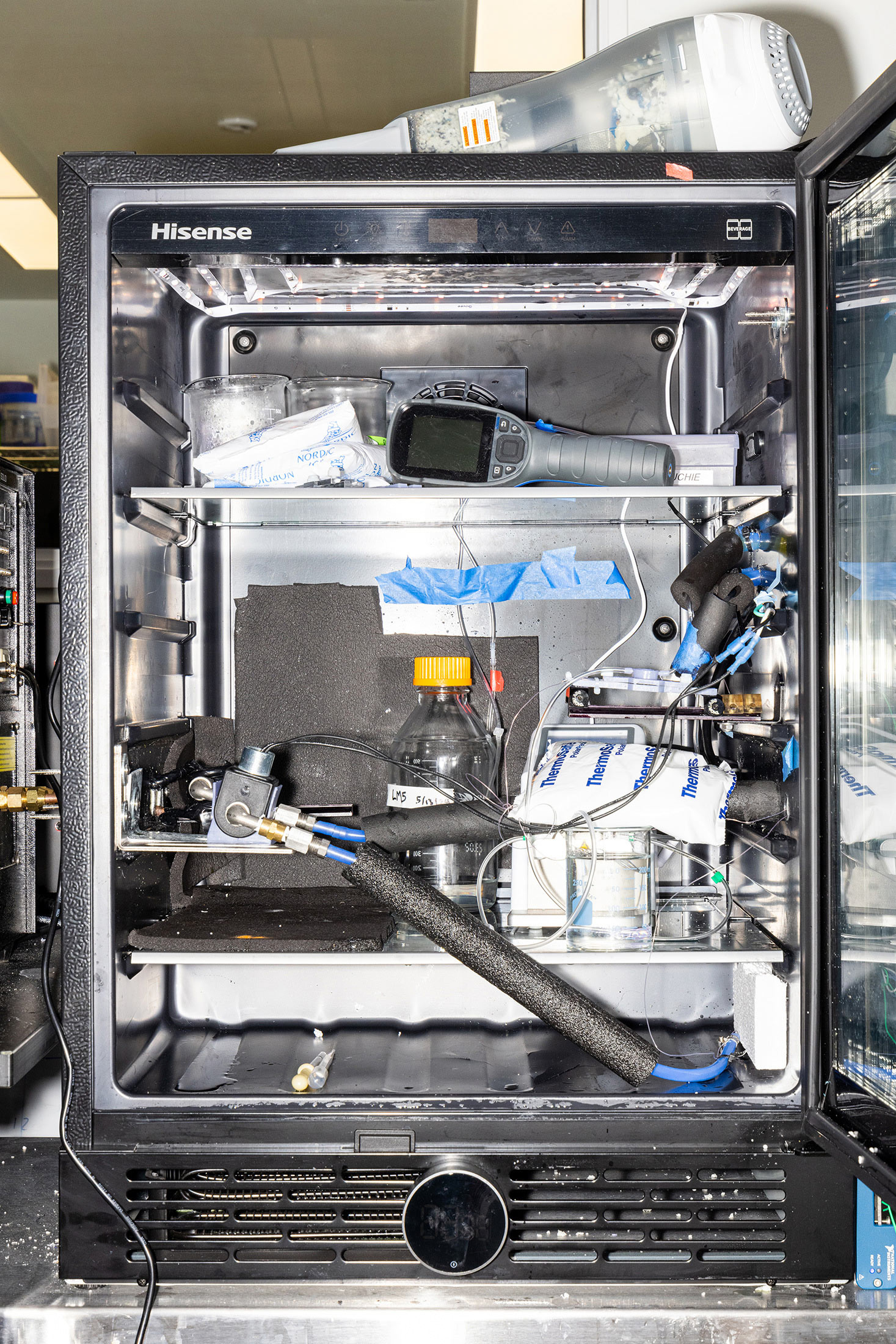 戴维斯在南旧金山Cradle研究实验室摄影师:杰森·亨利(Jason Henry)为彭博商业周刊拍摄戴明和戴维斯将理想的低温保存过程描述为将更大的样本降至-130摄氏度,同时形成最少量的冰晶。如果操作正确,样本中的液体应该大部分跳过冰晶形成阶段,直接变得粘稠且基本不活跃。“在那个温度下,一切都完全停止了,”戴维斯说。“液体进入这种类似琥珀或玻璃板的无定形状态。”这需要借助无毒的抗冻剂来完成,这是低温保存领域面临的另一个障碍。