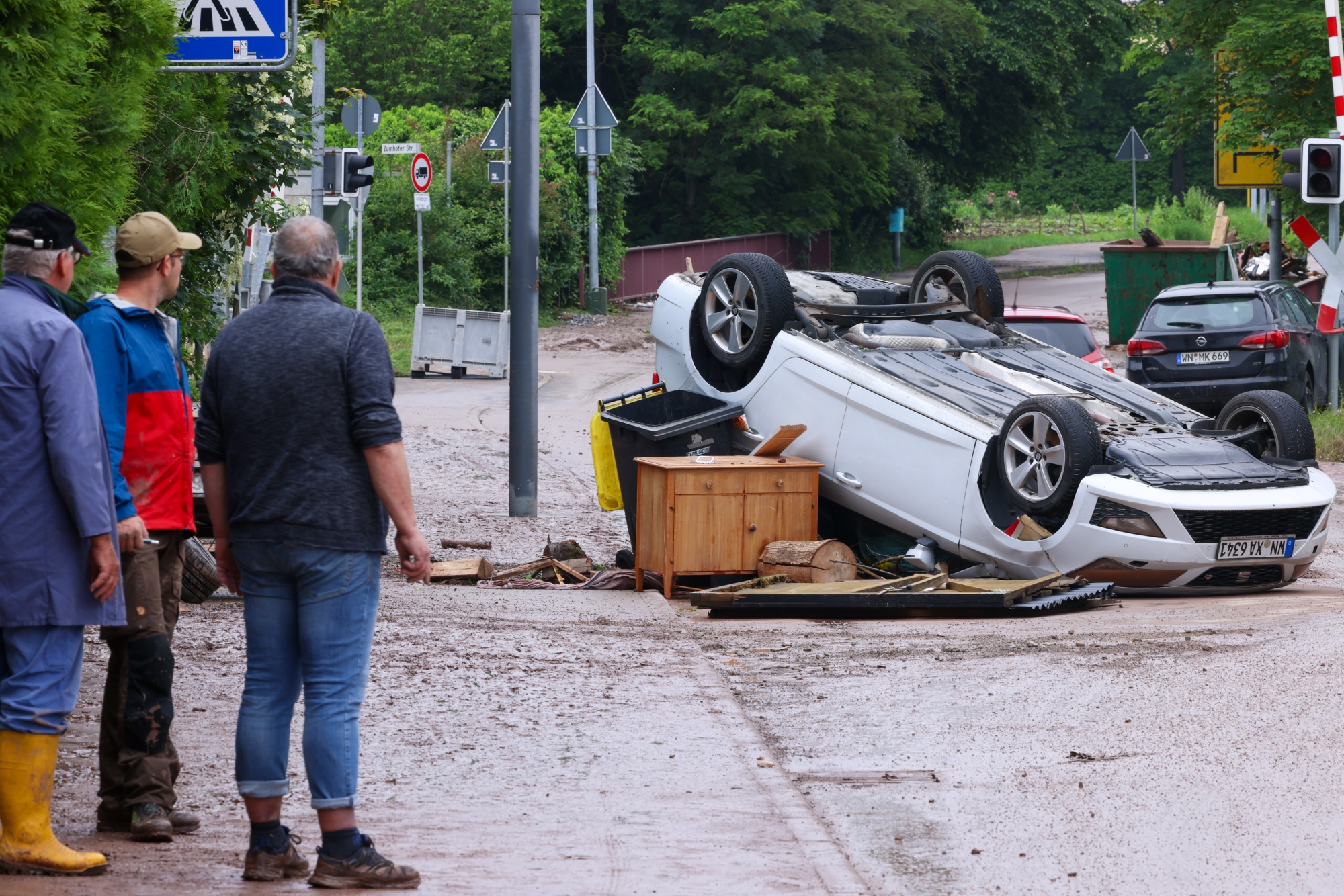 6月3日在鲁德斯贝格的一辆翻车和被遗弃的车辆。摄影师:亚历克斯·克劳斯/彭博社肖尔茨周一承诺,联邦政府将尽一切可能确保为受洪水影响的人提供帮助。