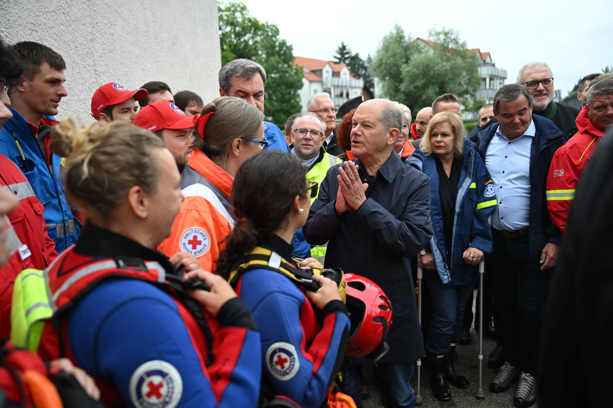 Olaf Scholz访问了德国南部Reichertshofen受洪水影响的地区,时间是6月3日。摄影师:Lukas Barth/AFP/Getty Images