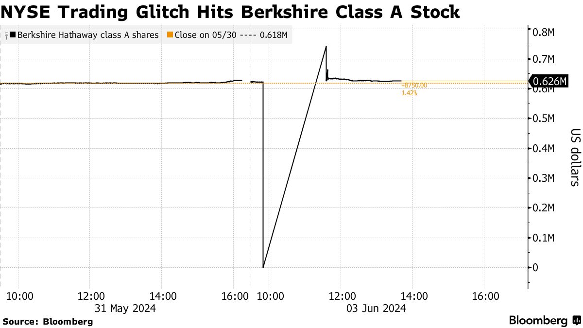 大约在早上9:50左右,伯克希尔A类股票有大约十几笔交易以185.10美元的价格成交。该股上周五收盘价为627,400美元。纽约证券交易所表示,任何在9:50至9:51之间以603,718.30美元或更低价格成交的交易将被取消。NuScale Power Corp.也出现了类似的故障,交易价格比之前的价格低了约99%。