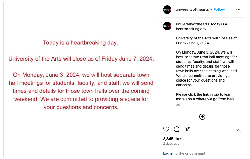 “与许多高等教育机构一样,UArts 处于脆弱的财务状态,多年来学生人数逐渐减少,收入下降,支出增加,”董事会主席 Judson Aaron 和学院校长 Kerry Walk 在5月31日的声明中表示。“我们正在努力理解当前的时刻。”