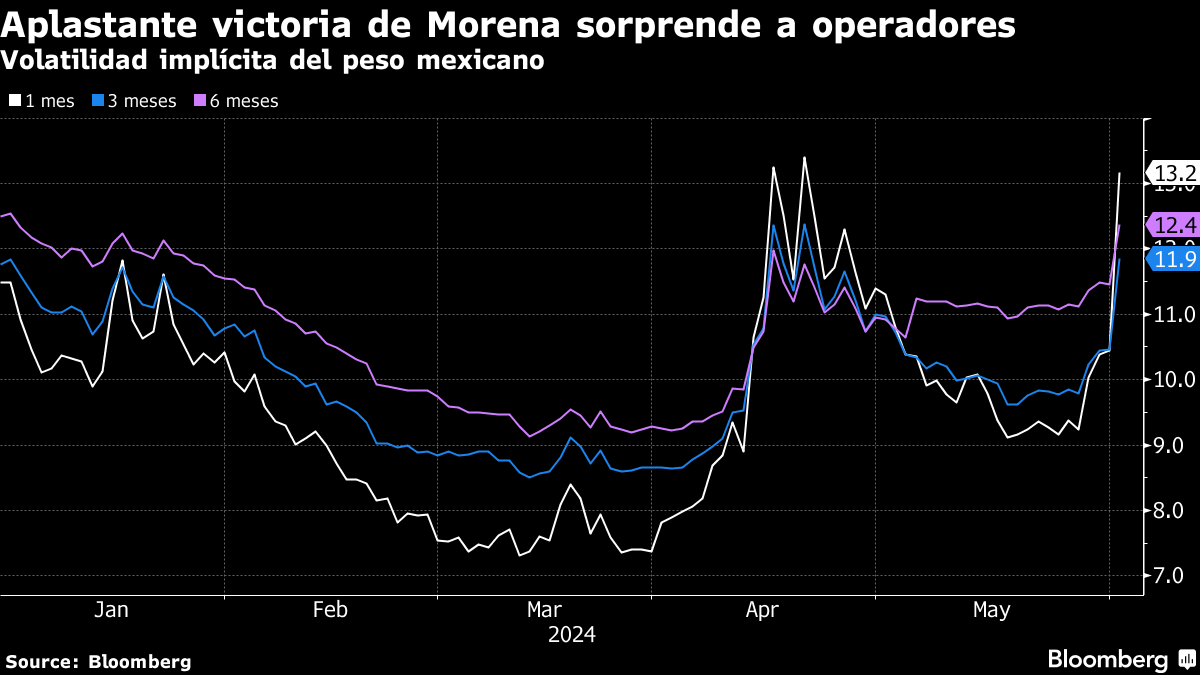在两院中获得三分之二的多数席位将使Morena能够进行宪法修改,这可能对墨西哥重要机构以及更高的最低工资构成潜在威胁。官方估计表明,Morena及其盟友在下议院拥有超过三分之二的多数席位,而参议院仍然未定。根据选举机构的估计,Morena、绿党和劳工党共有76至88名参议员,他们需要86名参议员才能获得超过三分之二的多数席位。人们谈论这个问题的事实对交易员来说是一个惊喜,可以从今天早上隐含波动率的反弹以及下面的图表中看出。然而,Morena想要的宪法修改并不一定对货币构成直接威胁。