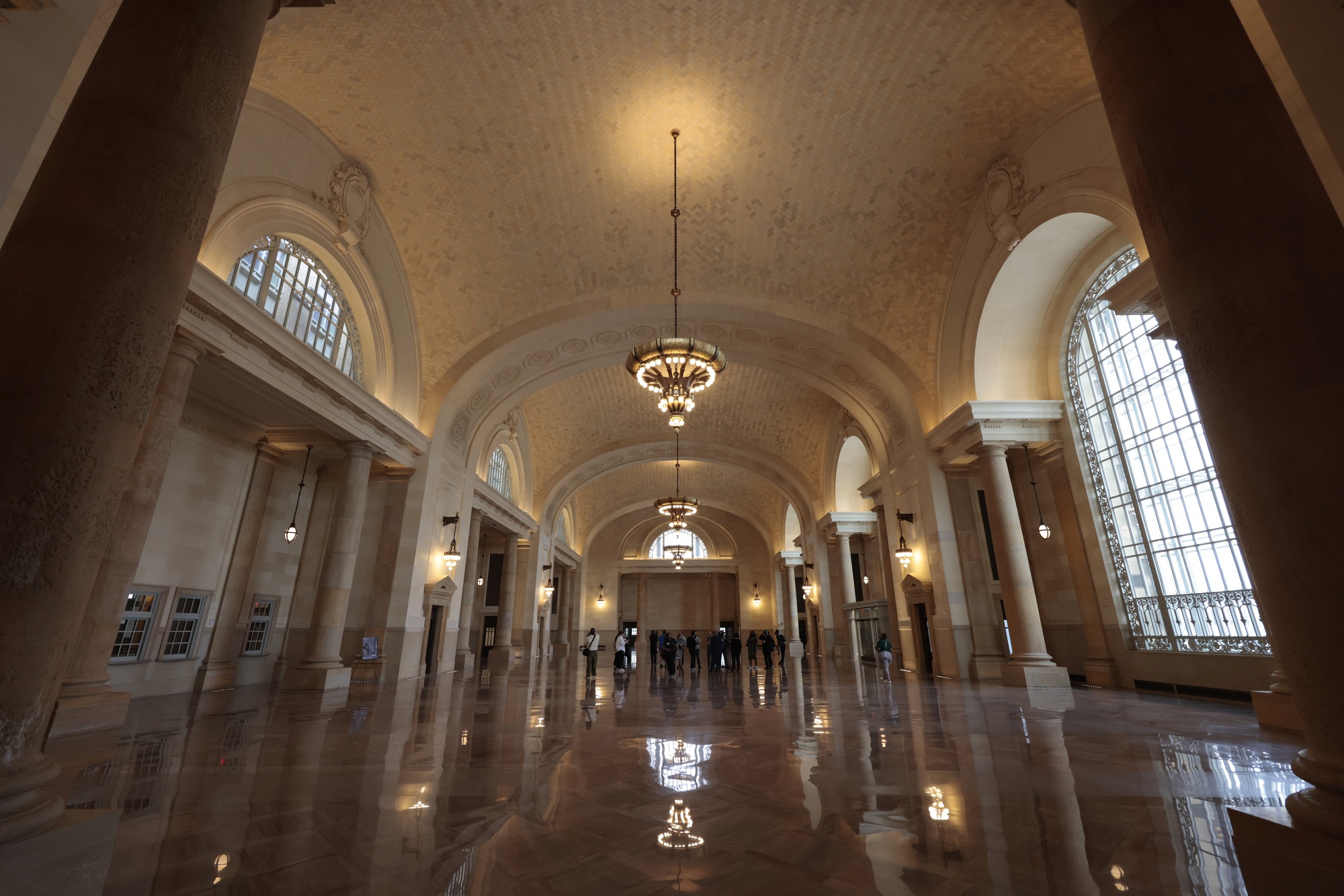 恢复车站和图书馆共耗资9.49亿美元,需要3100多名建筑工人的劳动。这个过程始于将350万加仑水泵出大部分没有屋顶的车站,这需要18个月的时间。一些水损仍然存在,表现为遍布整个内部令人印象深刻的石灰石柱上的麻点。