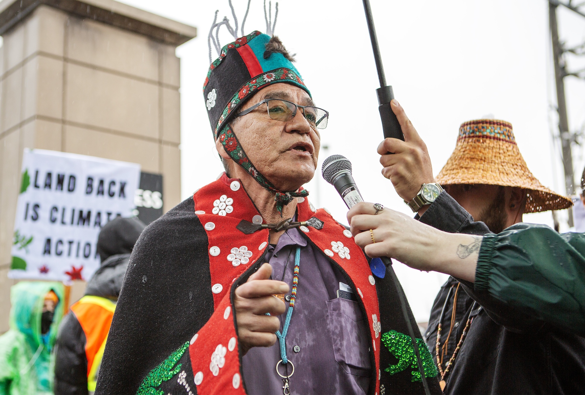 Wet’suwet’en 部落的传统首领 Na’Moks 在四月份在多伦多皇家加拿大银行年度股东大会外对抗议者讲话。