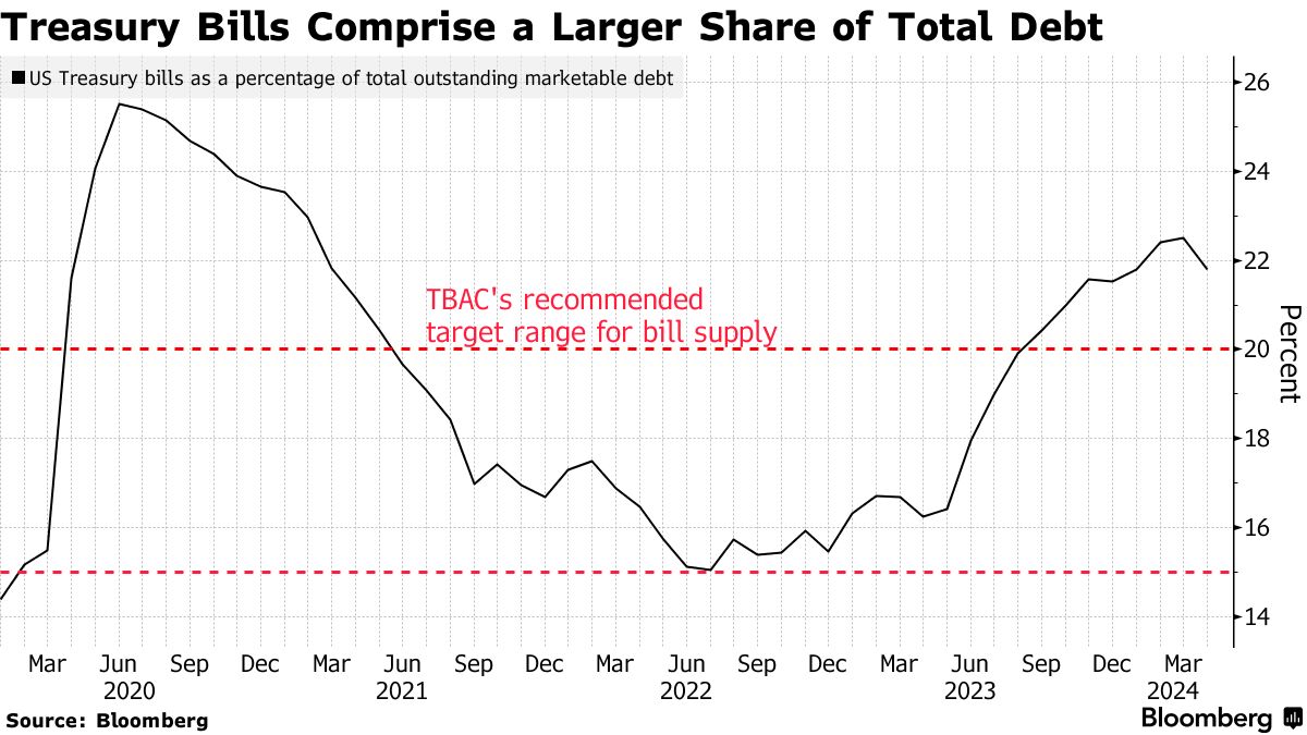 截至4月30日,到期期限为一年或更短的票据占可销售的国债的21.8%,连续第七个月超过了投资者、经销商和其他市场参与者组成的财政部借款咨询委员会建议的15%至20%的阈值。该会议记录显示,自原始指导以来几年间需求强劲,委员会倾向于重新审视该建议。