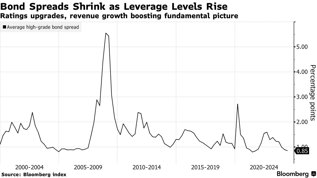 “投资级利差在市场杠杆上升时收窄并不罕见,”策略师们写道。“杠杆是关键的信用基本面指标,但对于投资级债券,其他因素通常驱动利差。”