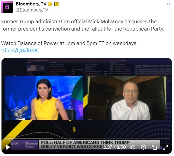 今天在Bloomberg电视台的权力平衡早间版节目中,主持人乔·马修和凯莉·莱因兹采访了前特朗普政府官员米克·马尔瓦尼,谈论了特朗普在纽约审判后对共和党的影响。