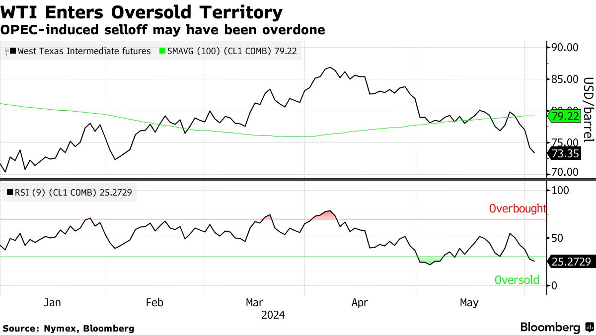 国际基准布伦特原油周一首次跌破每桶80美元,为四个月来首次,周二是布伦特自2023年5月以来首次突破14天相对强弱指数的阈值。