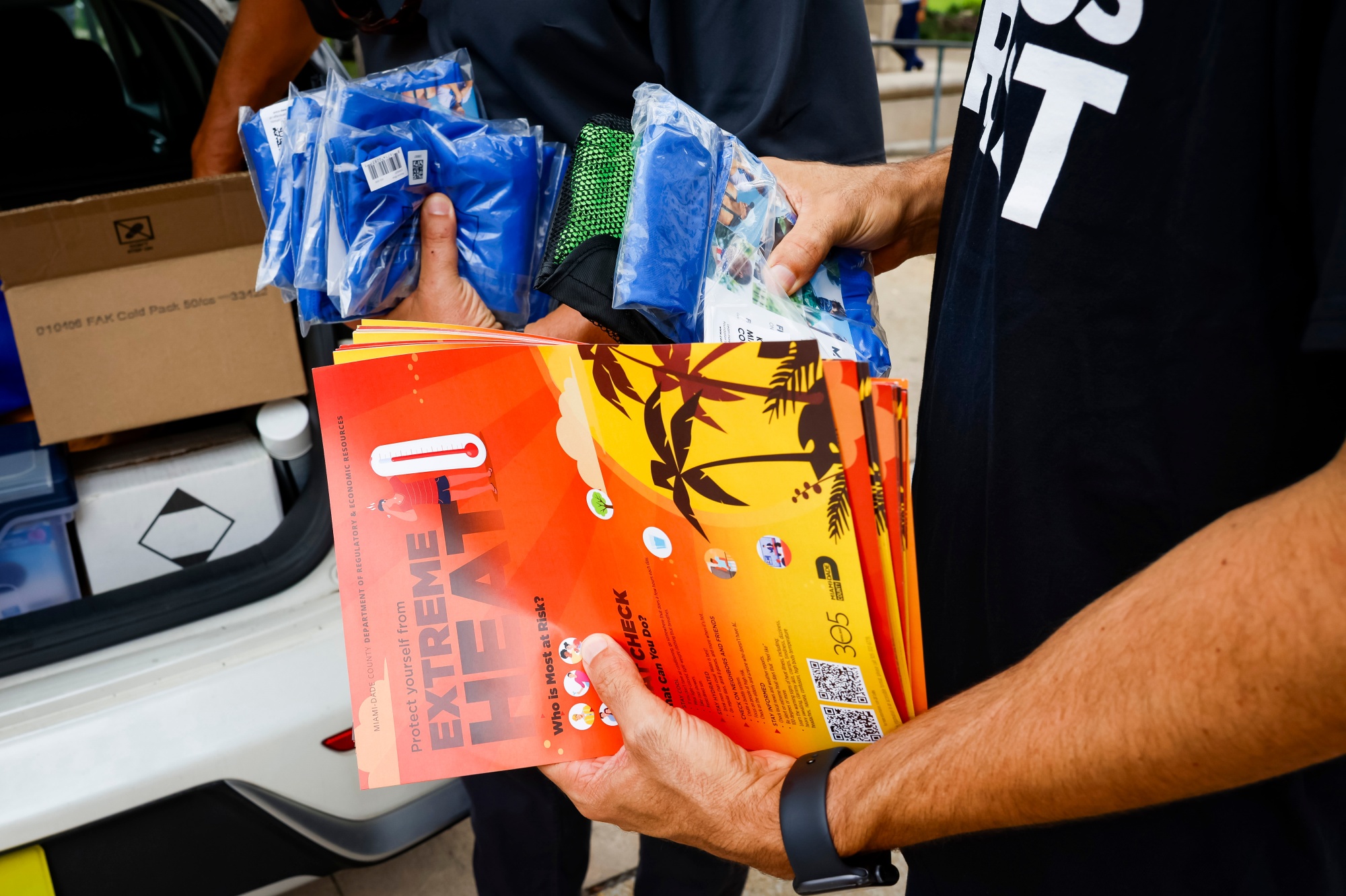 2023年7月,迈阿密戴德县无家可归信托代表在一次热浪中分发庇护所信息。摄影师:Eva Marie Uzcategui/Bloomberg### 确保人们了解热风险