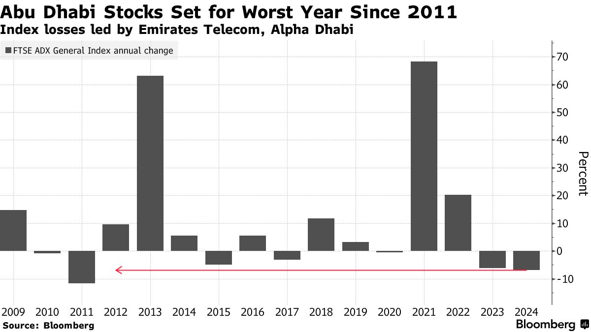 阿布扎比综合指数自2024年以来每个月都下跌,这使其有望连续第二年亏损,并且是自2011年以来表现最差的一年。