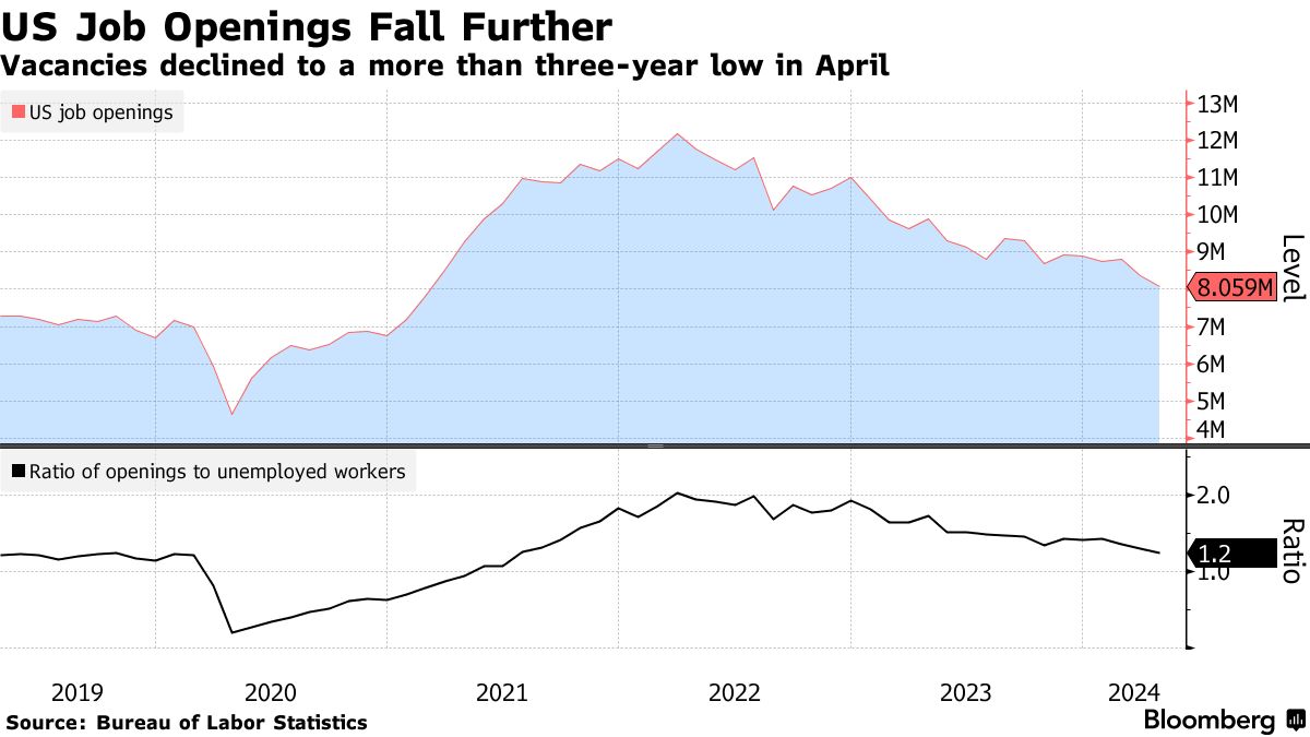 美国四月份的职位空缺降至三年多来的最低水平,与劳动力市场逐渐放缓的趋势一致。