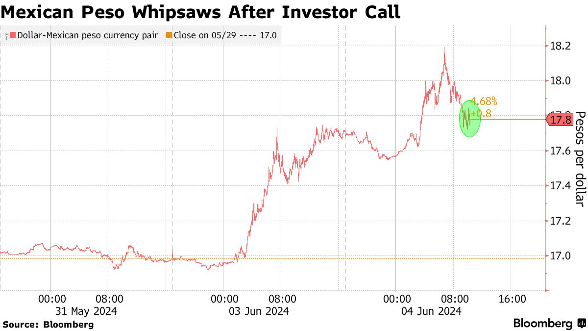 此次电话会议旨在缓解投资者的担忧,此前墨西哥比索在选举后下跌了3.8%,创下自2020年6月以来的最大单日跌幅,因为比预期更强的多数意味着执政党将能够推进国会改革。在与投资者的对话开始之前,货币已经收窄了损失,并在电话会议后下跌了0.7%。