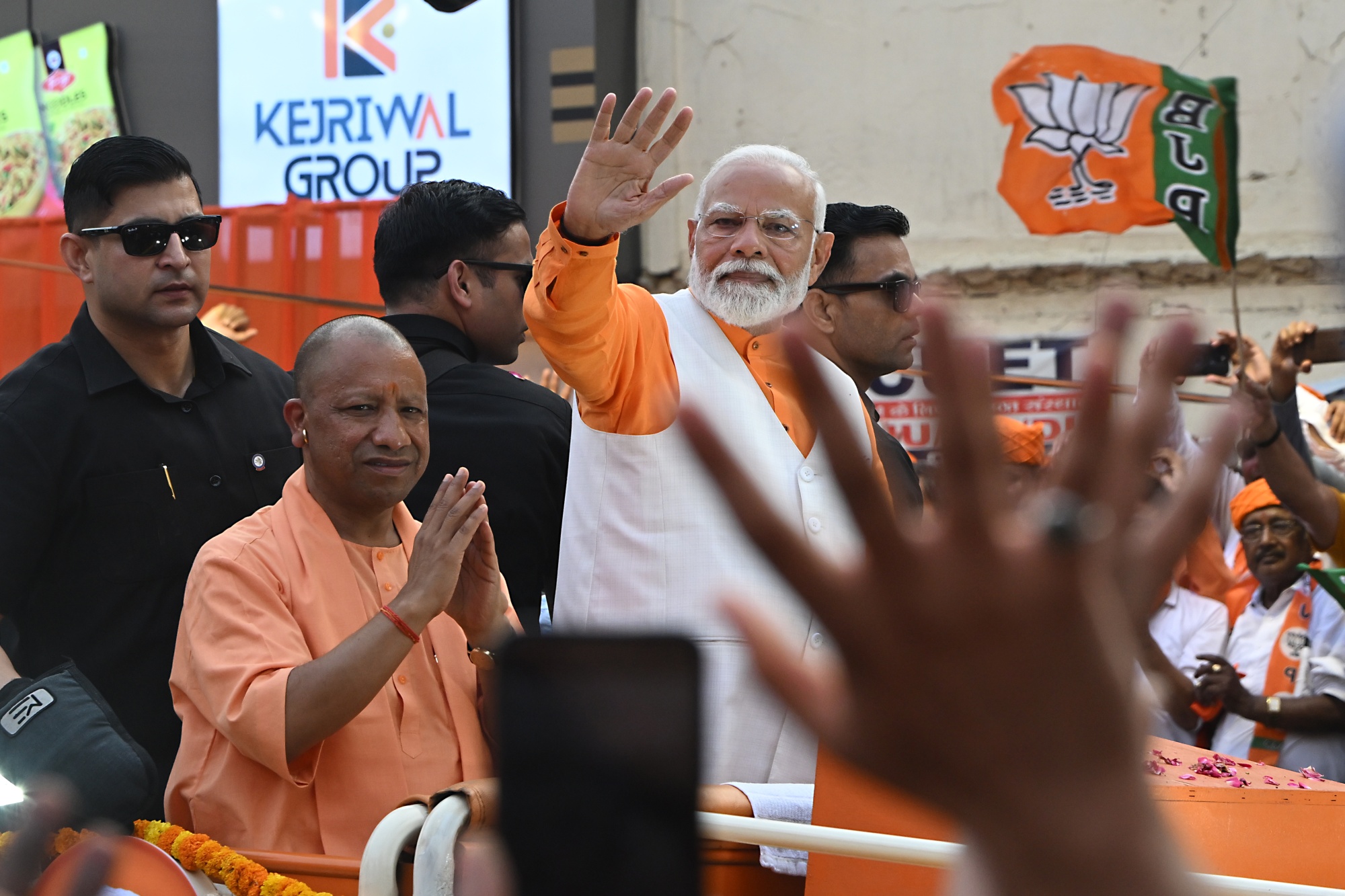 莫迪,中间,与北方邦首席部长约吉·阿迪亚纳特,左中,于五月在瓦拉纳西的竞选集会上。摄影师:普拉卡什·辛格/彭博社### 莫迪和他的政党出了什么问题?