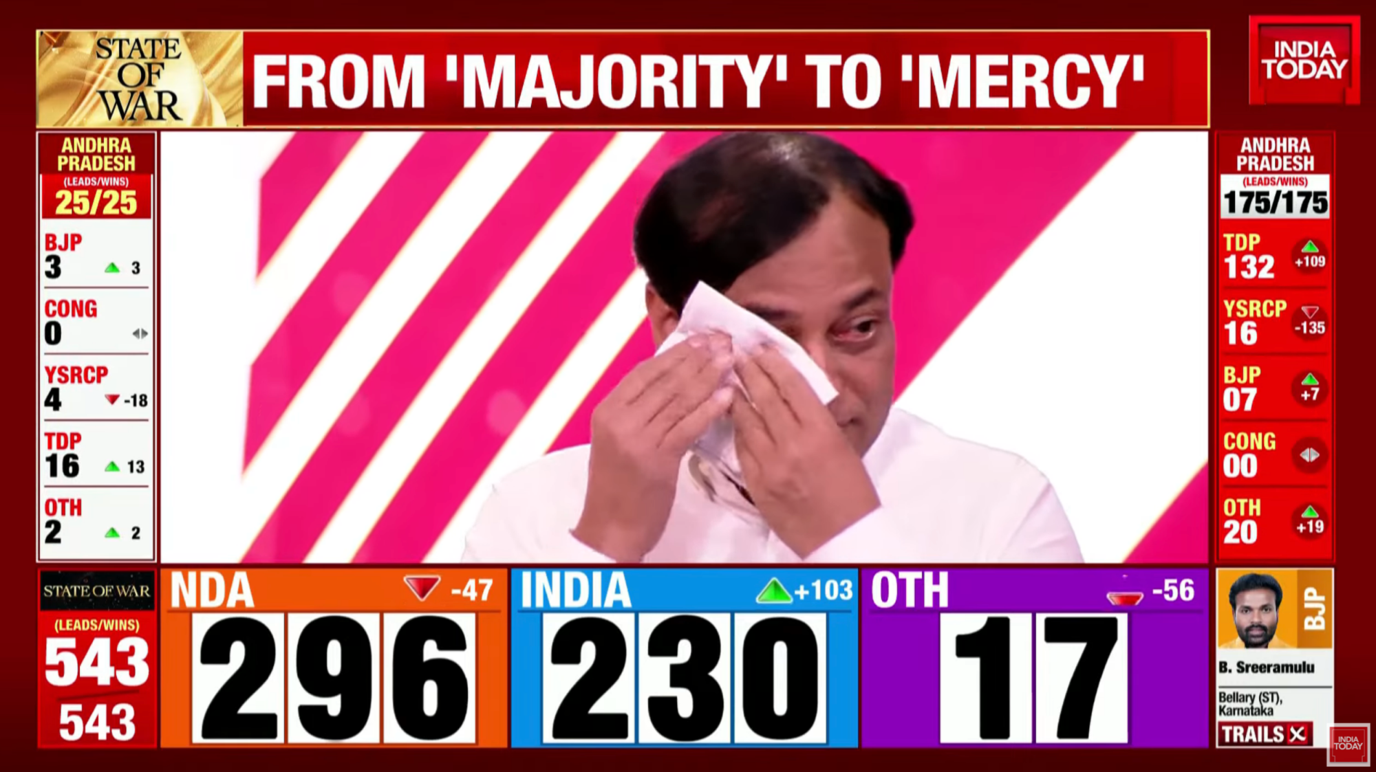 哈哈,嗯,这段视频显示了印度 Axis My India CEO Pradeep Gupta 在直播电视节目中因其出口民调预测出现偏差而哭泣,这正好说明了 Andy 是多么正确。“在生活中,你不能一切都做对,”主持人在民调专家抽泣时告诉他,另一位与会者拍拍他的背,递给他一盒纸巾: