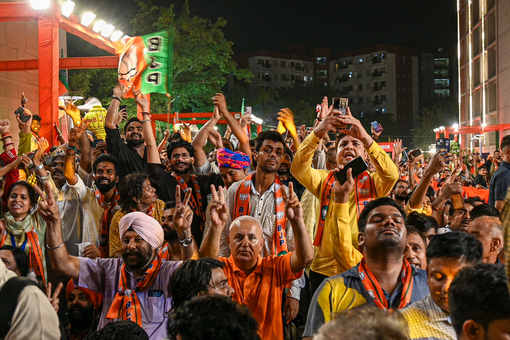 纳伦德拉·莫迪的印度人民党支持者在星期二的选举结果之夜在新德里总部外。
