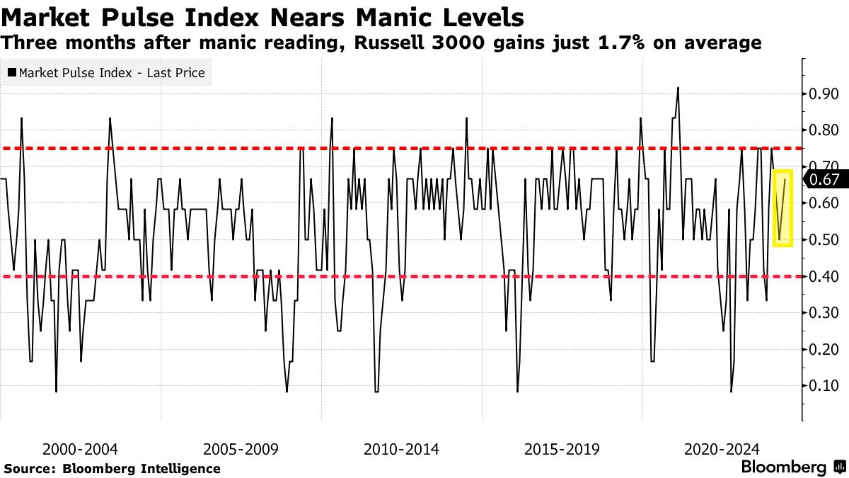 彭博智库市场脉搏指数,作为一个逆向信号的情绪指标,在上个月接近“狂热”领域。 这是一个罕见的迹象,通常会在短期内抑制美国股票的回报。 在狂热阅读后的三个月内,罗素3000指数的平均涨幅为1.7%,而在恐慌后为9.1%。