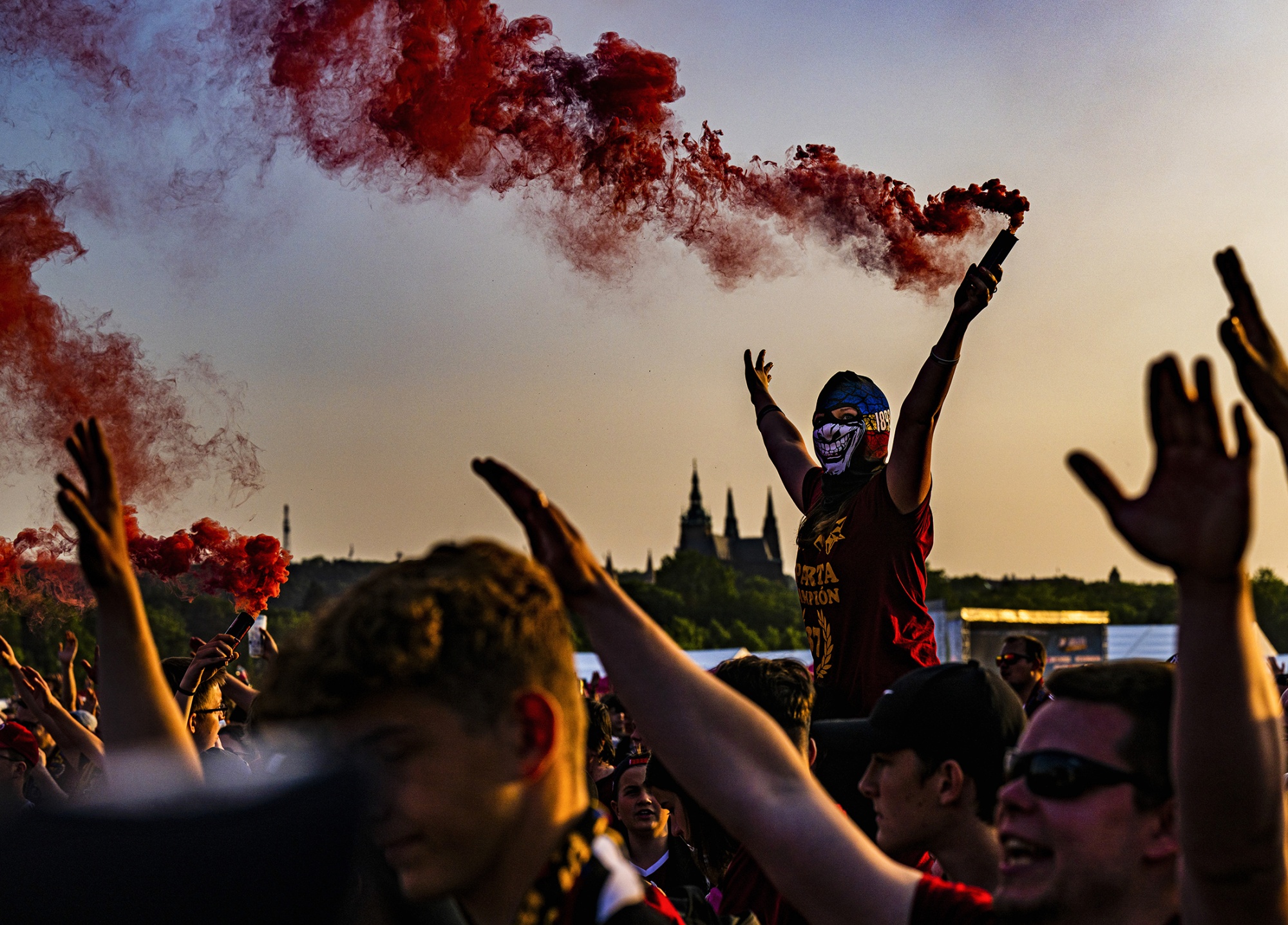 斯巴达球迷在2023年5月27日的布拉格庆祝俱乐部九年来的首个冠军。球队今年又赢得了另一个冠军。