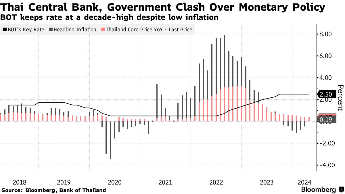 这一分歧促使前总理他信·西那瓦特的女儿、泰党党首派通塔恩·西那瓦特公开指责泰国央行的自治权是振兴东南亚第二大经济体的“障碍”。几周内,财政部长皮查伊·春哈瓦吉拉呼吁重新审视央行的通胀目标,称其需要反映当前的经济状况 — 消息人士称这是一种施压策略,旨在促使央行调整货币政策。