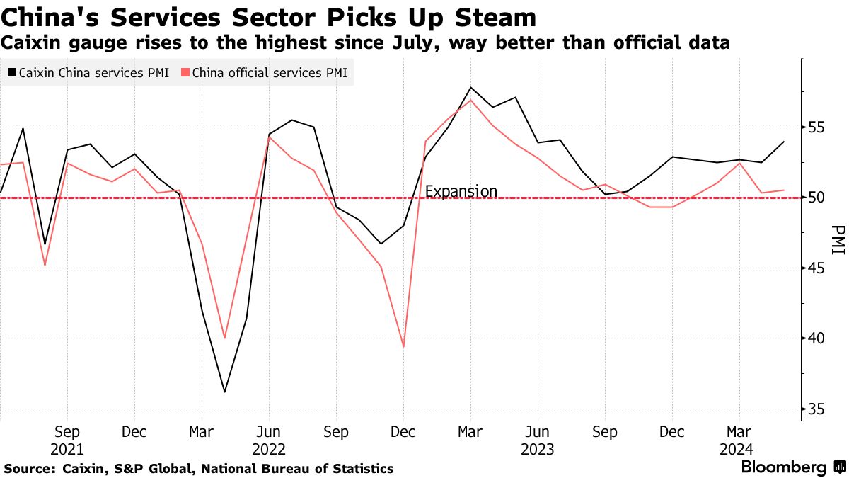 根据周三由财新和标普全球联合发布的声明,财新中国服务业采购经理人指数在5月份升至54,这是10个月来的最高水平,超过了彭博调查的经济学家中值预测52.5。任何高于50的读数都表示扩张。