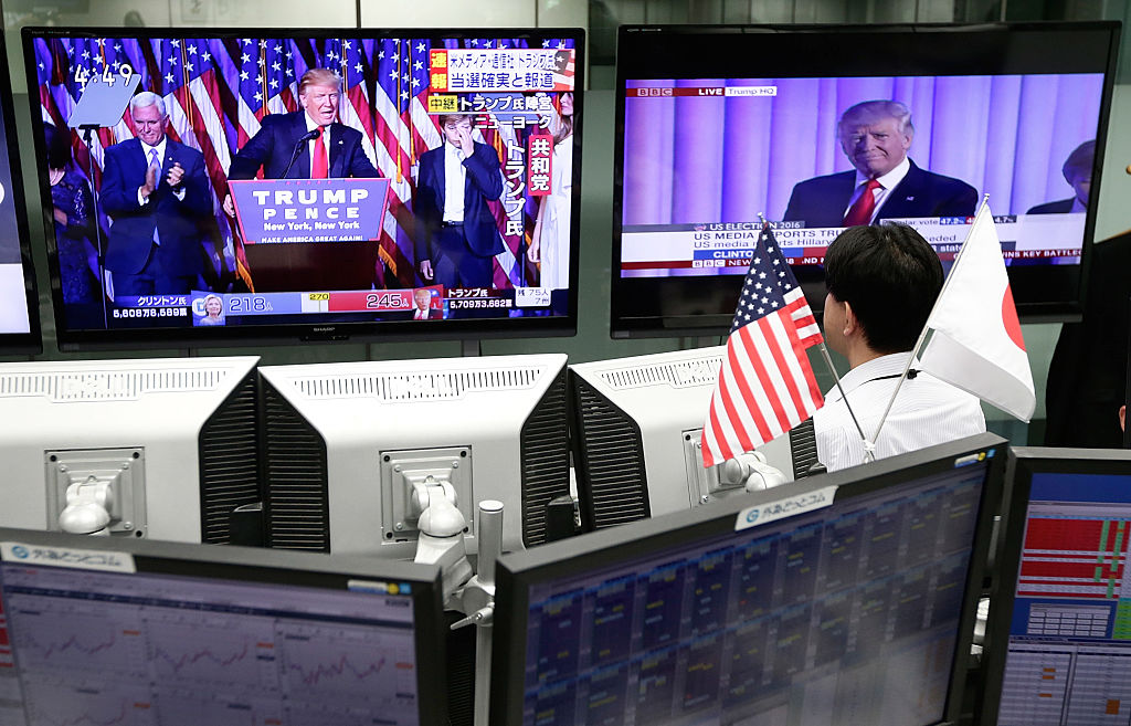 在东京外汇交易台。摄影师:Yuya Shino/Getty特朗普发表胜选演讲的场景突然让投资者关注他可能在任职期间会做什么,市场情绪认为他对经济增长有好处。相信民调是一个坏主意,预测资产价格如何对任何给定结果做出反应也是不明智的。那些不相信民调或特朗普的普遍说法的人赚了很多钱。