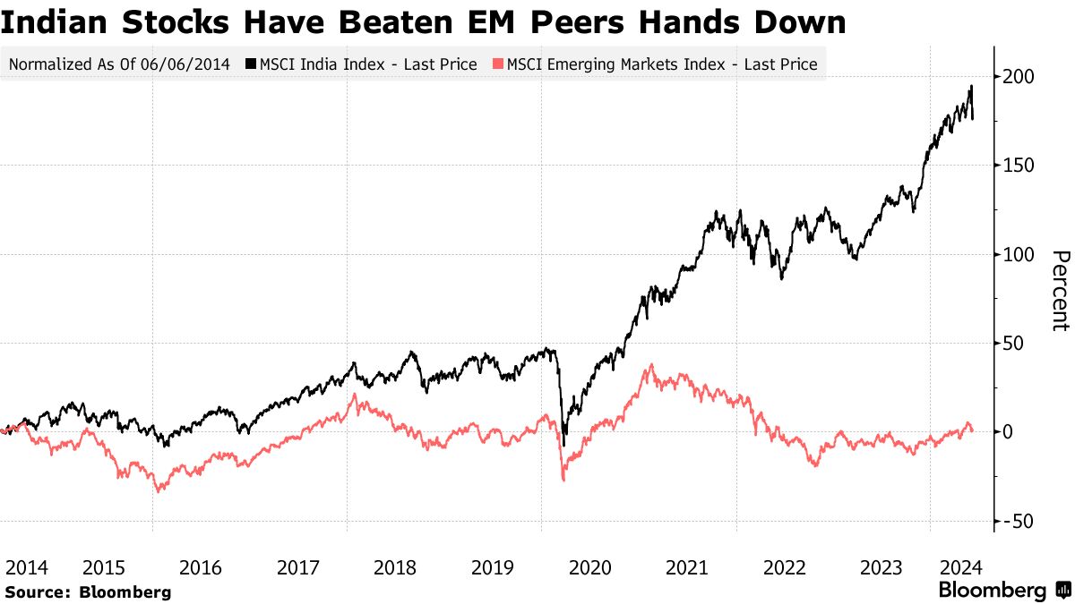 过去20年,印度的经济增长和股市价值同步增长了数倍。自莫迪上台以来的十年间,股市增长了200%以上,价值在周二的暴跌前接近 $5万亿,其中$1.5万亿是在过去一年内增加的。印度股市正朝着第九个年度涨幅迈进,表现优于MSCI新兴市场指数。