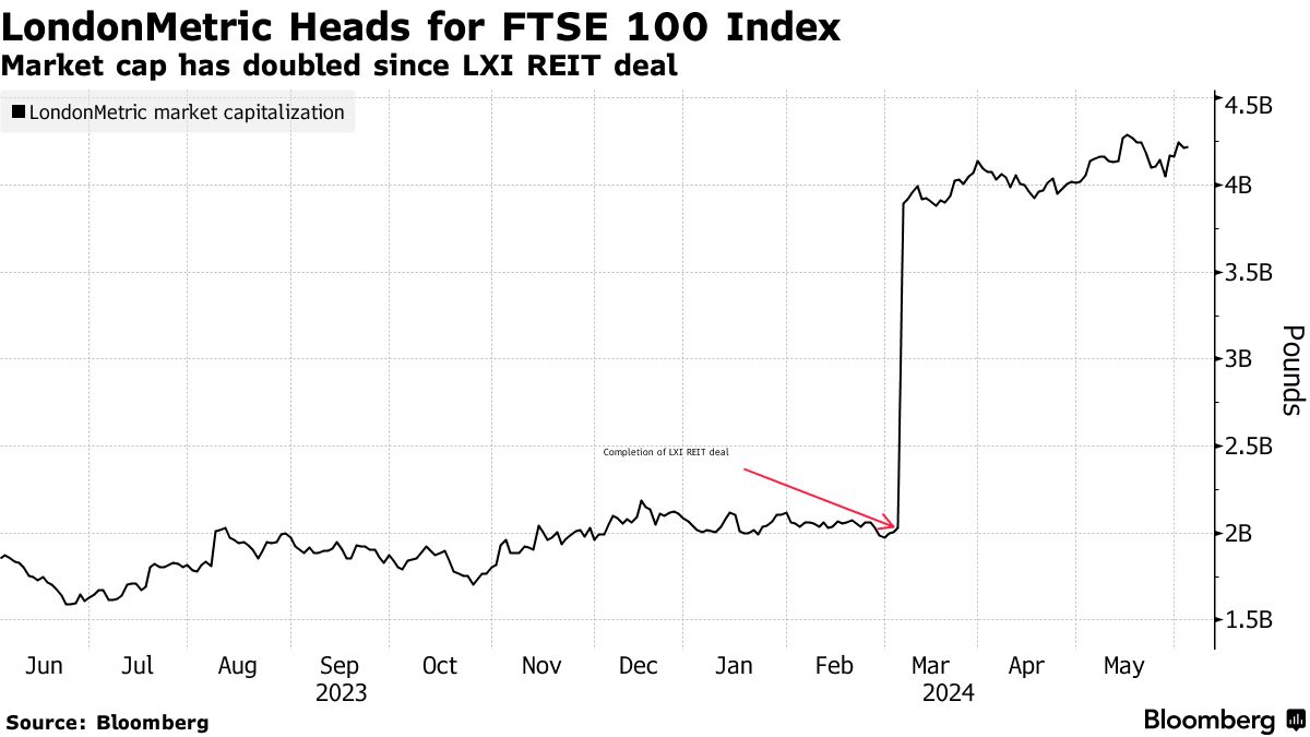 伦敦度量股价今年上涨了7.3%,而在3月份对竞争对手英国地产投资信托公司LXI REIT股份有限公司的19亿英镑收购后,其市值翻了一番,使其有资格晋升为富时100指数。这家总部位于伦敦的公司本周报告了20%的利润增长并提高了股息。