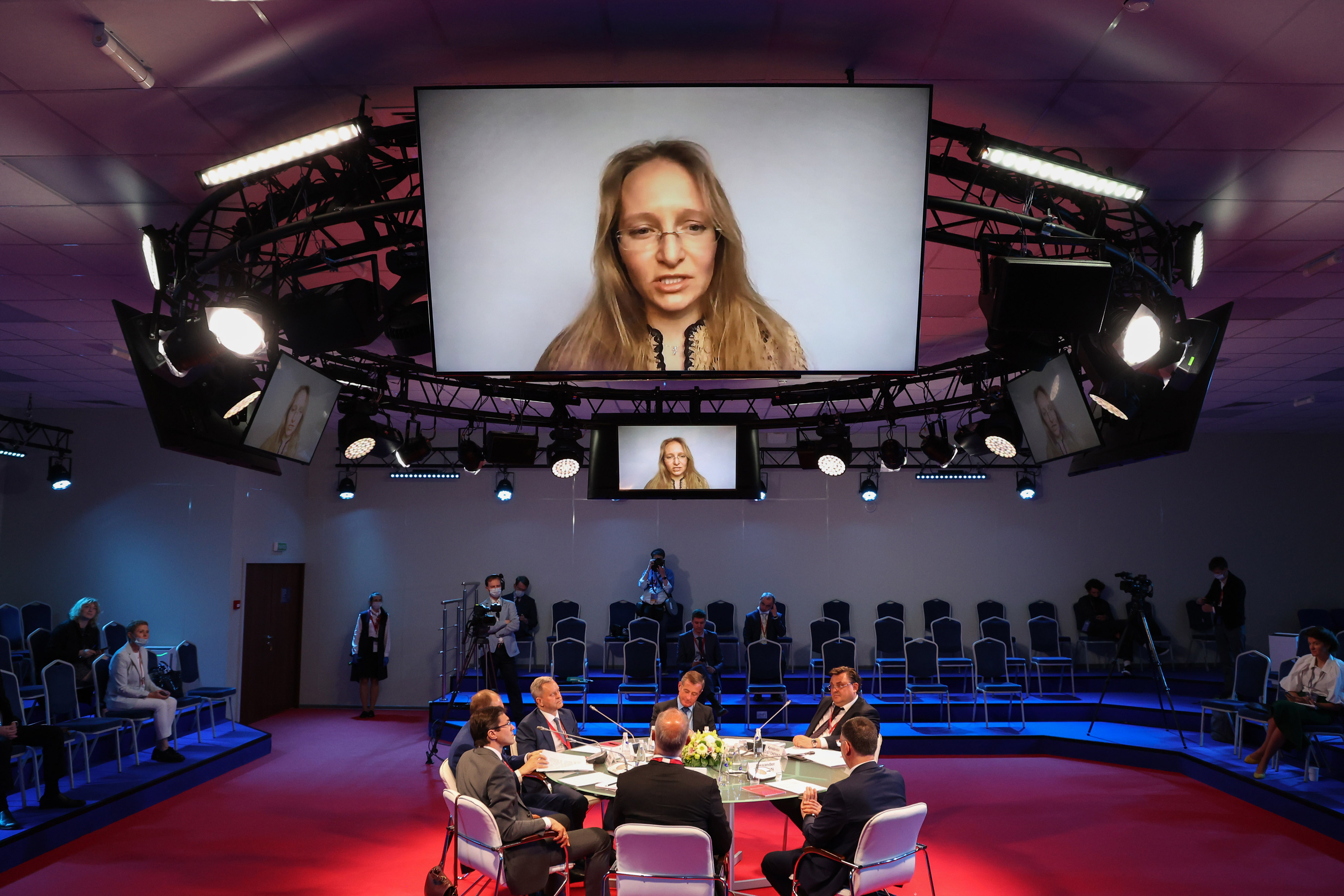 2021年,普京的女儿卡捷琳娜·蒂霍诺娃通过视频连线参加SPIEF的一个小组讨论。摄影师:安德烈·鲁达科夫/彭博社### 彭博更多内容