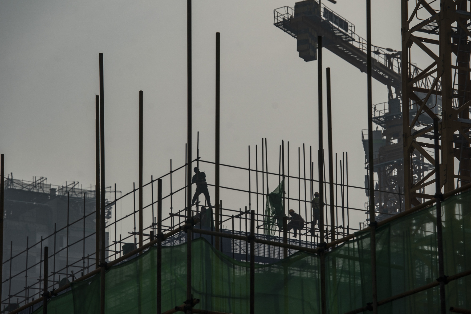 工人们站在住宅建筑工地的脚手架上。摄影师:沈启赖/彭博社违约的建筑商中国南城控股有限公司的最大股东正面临一项涉及该国开发商广泛使用的模糊信用保护机制的14亿美元诉讼。