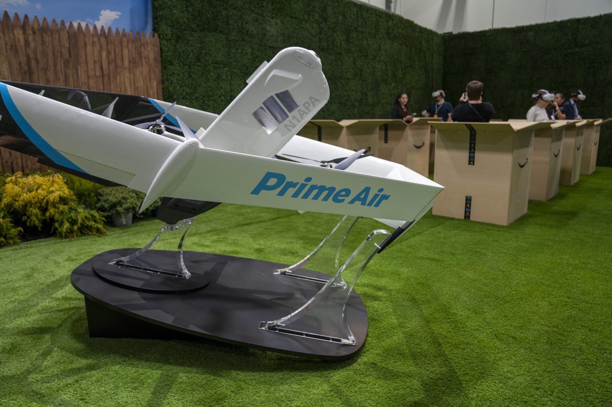 亚马逊Prime Air MK27-2无人机在马萨诸塞州的一个亚马逊设施展示。