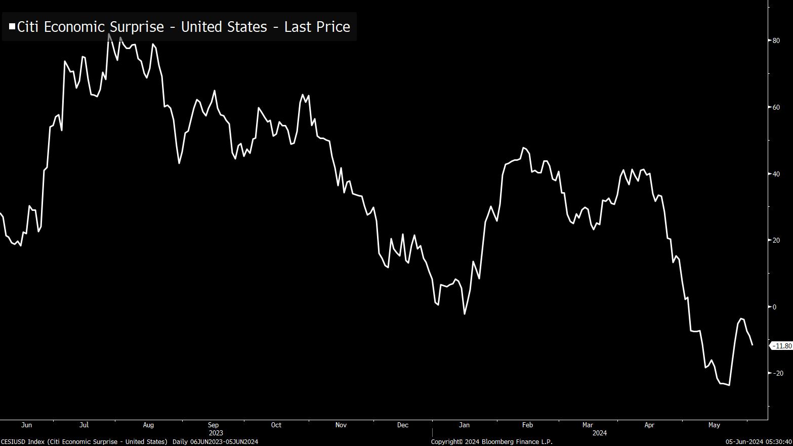 与此同时,花旗银行的美国经济惊喜指数自5月初以来一直为负值,并在过去几天再次下滑。