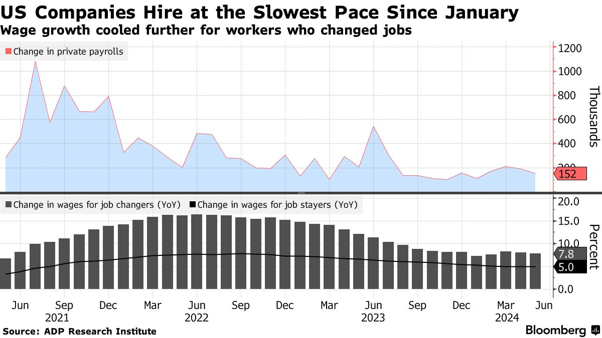 美国公司的招聘在五月份增长速度自年初以来最慢,受到工厂工资单急剧下降的限制,这进一步证明劳动力市场正在降温。