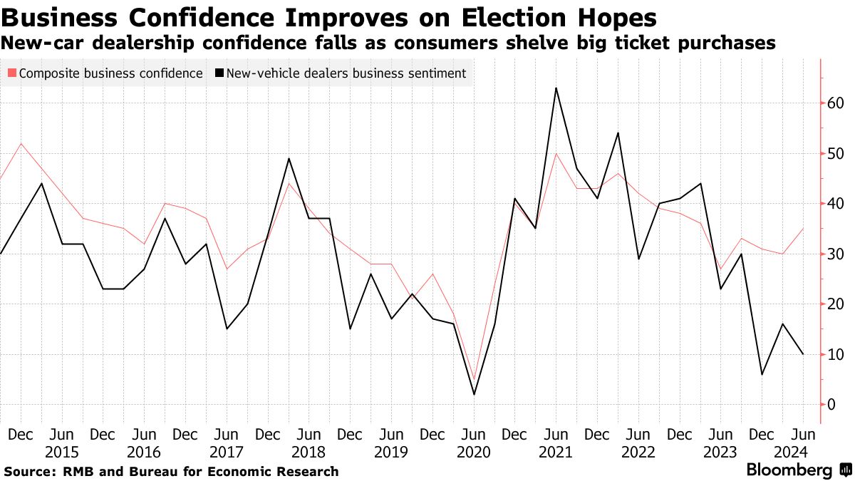 “选举前的商业信心出现了令人欣慰的上升,但仍低于促进增加私人部门投资和更快经济增长的水平,”兰德商业银行首席经济学家兼研究主管Isaah Mhlanga表示。“今年余下时间通胀率降低,以及今年晚些时候可能降低政策利率的可能性可能会刺激消费支出。”