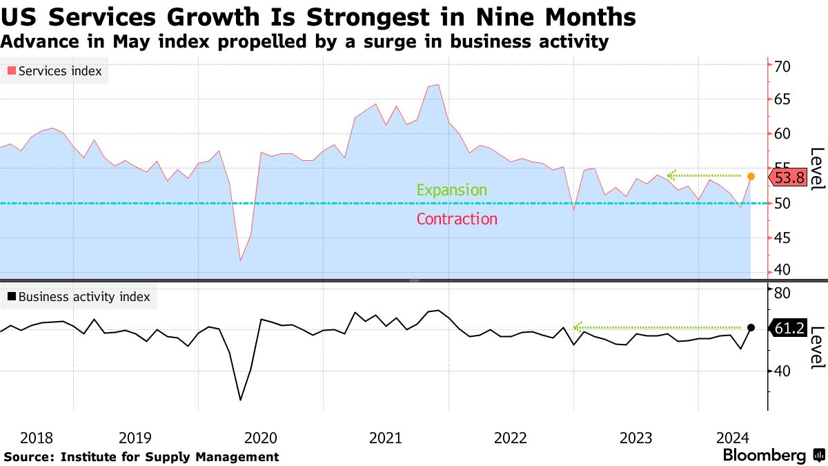 供应管理协会的服务业综合指数跃升了4.4个点,是去年年初以来最大的增长,达到了53.8。50以上的读数表示扩张,而五月份的数据超过了经济学家在彭博调查中的所有预测。
