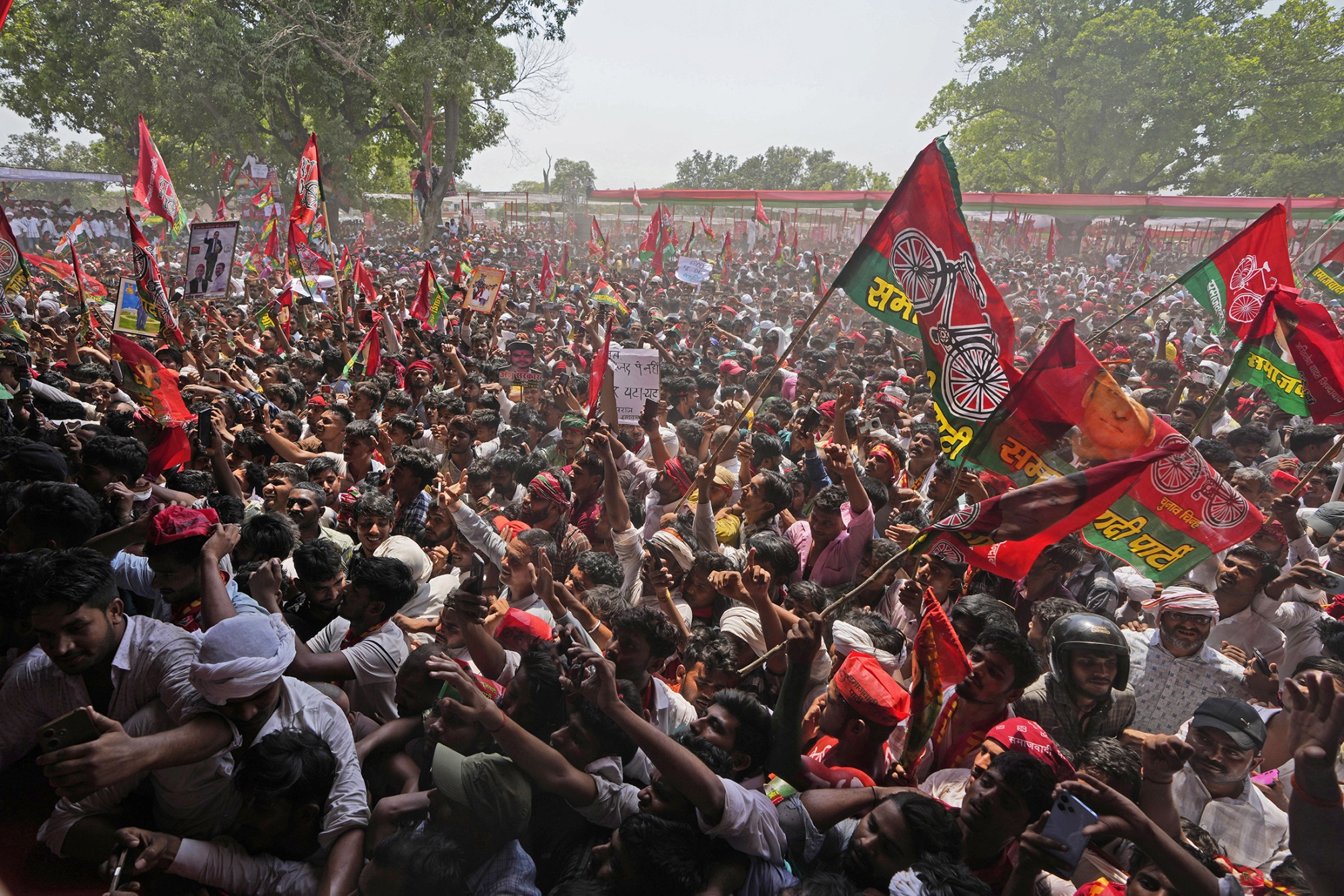 萨马吉瓦迪党和印度国大党支持者在五月份在北方邦的一次集会上。莫迪在北方邦的支持率下降,人民党仅获得80个席位中的33个。