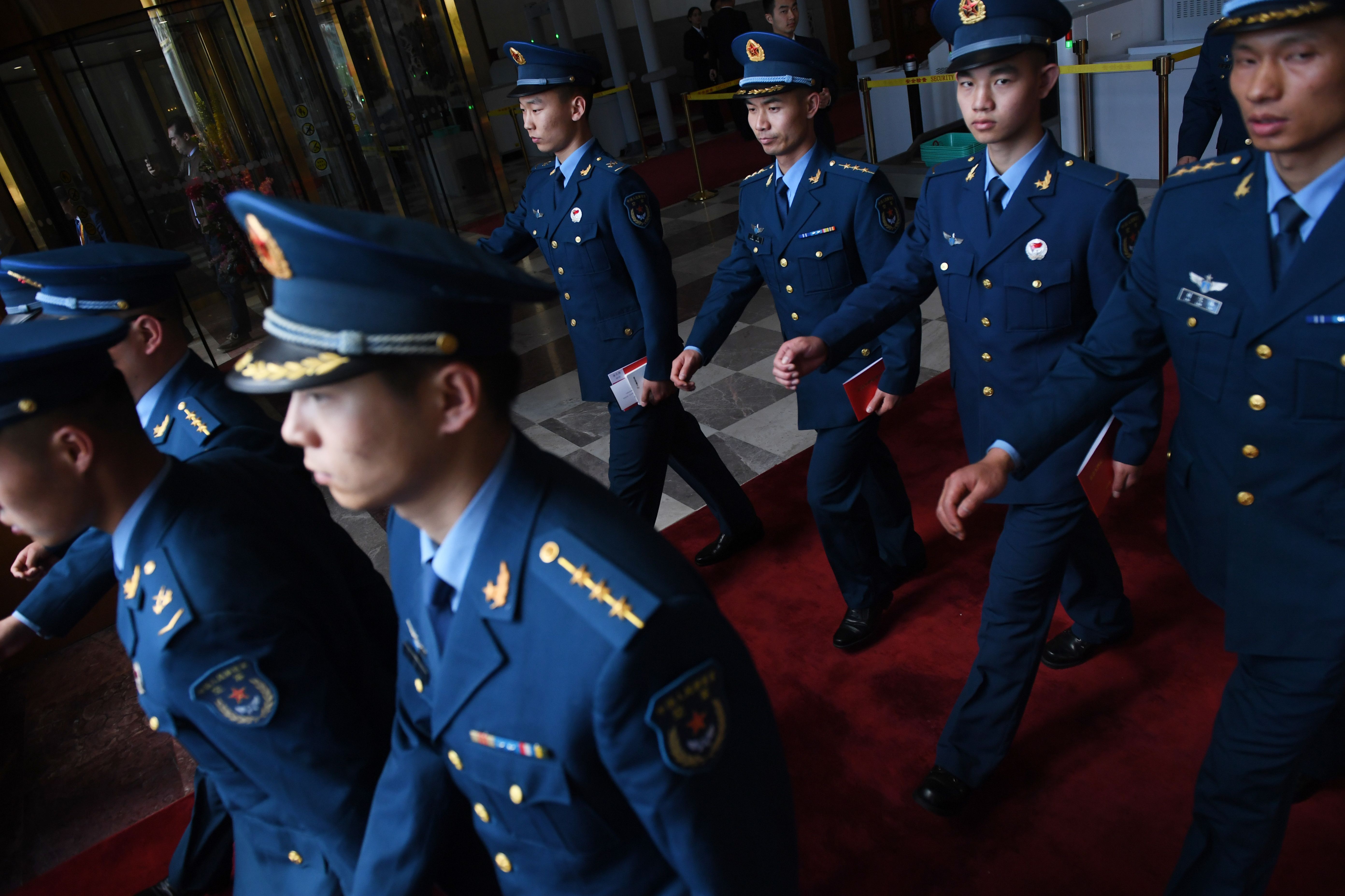 中国人民解放军空军成员在2019年在北京人民大会堂内行进。