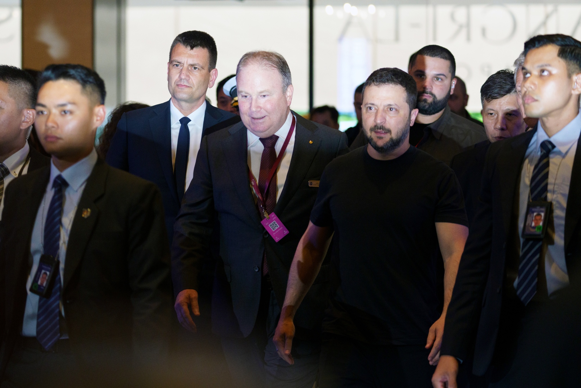 摇滚明星入口设计旨在吸引注意力,乌克兰总统弗拉基米尔·泽连斯基在新加坡香格里拉酒店参加首届亚洲防务峰会时正是如此。身穿标志性的绿色T恤和军事裤,身边是保镖,就像防务和安全界的泰勒·斯威夫特降临到外交政策舞台上一样。