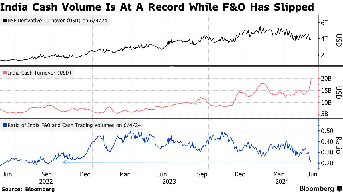 周二的4000亿美元抛售并非本周股市的唯一亮点。随着对莫迪再次掌权的担忧加剧,外国投资者抛售了价值14亿美元的股票,创下有史以来最大的单日抛售记录。这一激增使现金交易量达到新高,超过200亿美元。与此同时,衍生品交易量下滑,将两者之间的比率缩小至近两年来的最低水平。