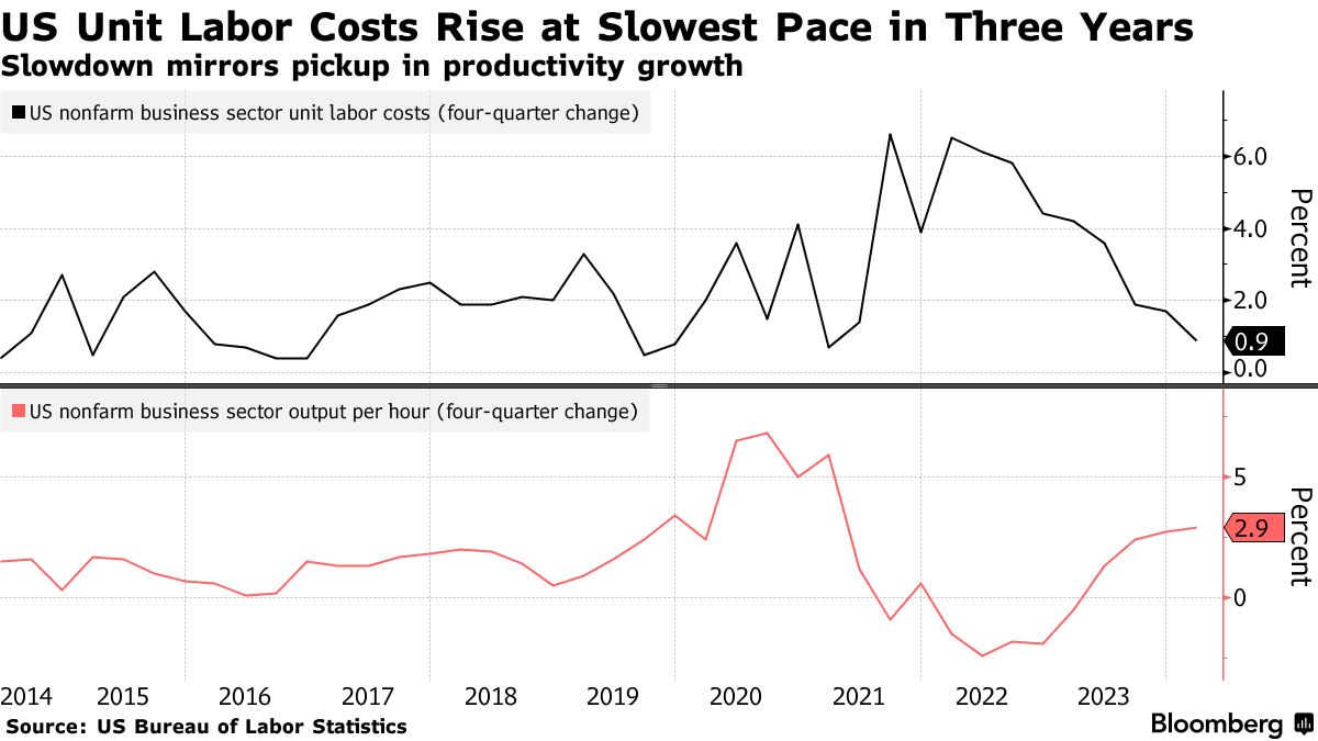 尽管单位劳动成本有所下降,但增速仍然比2023年下半年的稳定时期快,当时该国实现了强劲的生产率增长。劳动成本在第一季度跳升并不罕见。它们往往在随后的时期趋于稳定。