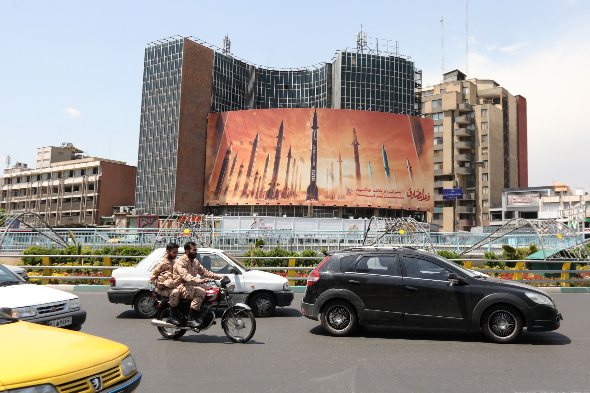 驾驶员驾驶他们的车辆驶过德黑兰一块描绘伊朗导弹的广告牌。